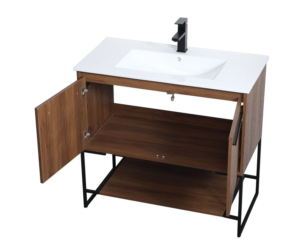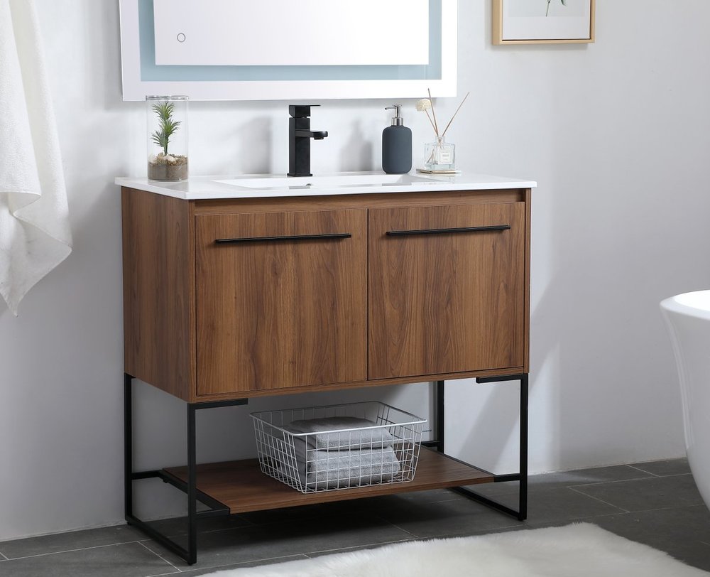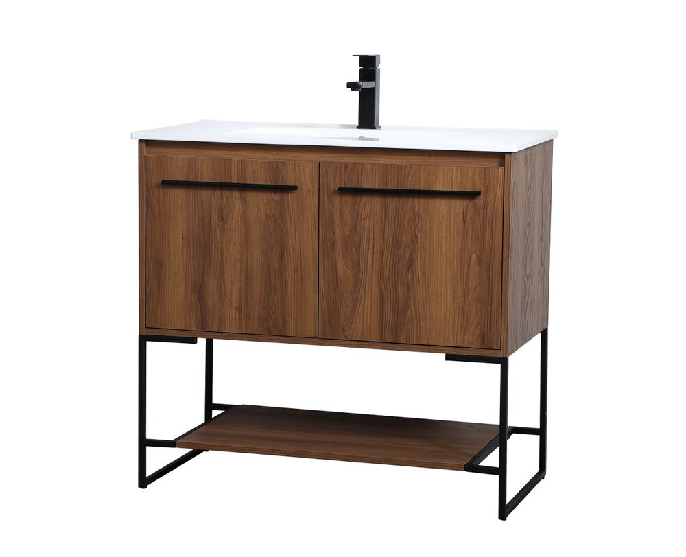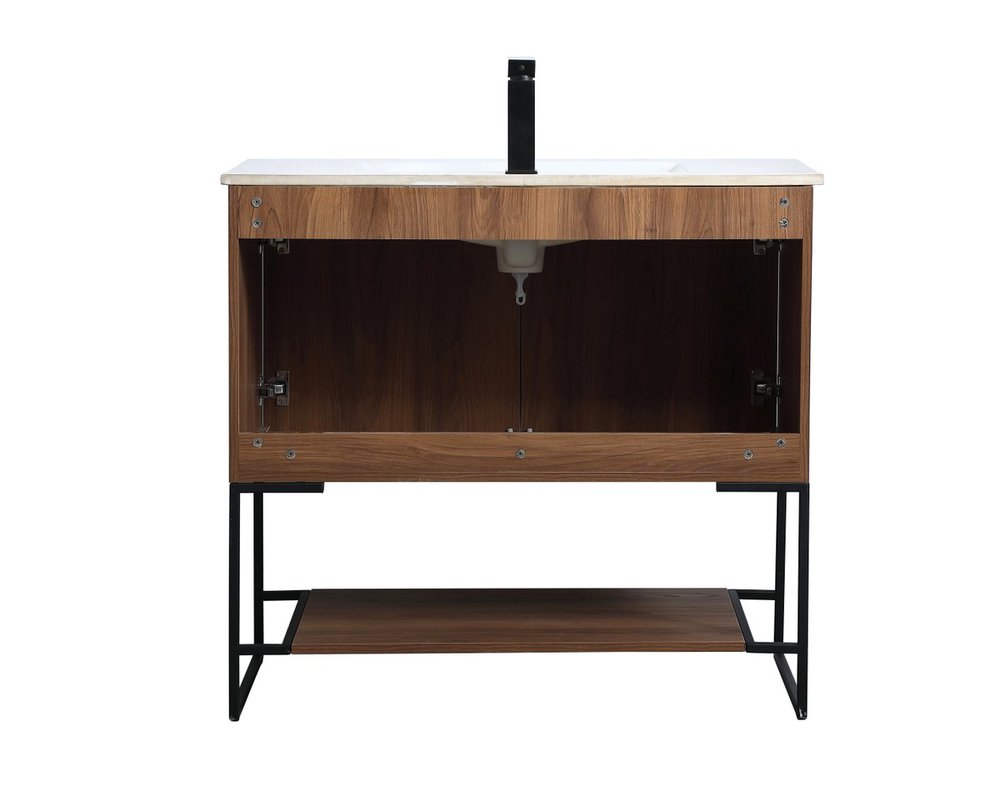 Live in modern comfort with this 36" walnut brown finish vanity. Dressed in a concrete grey and sleek black metal hardware, its contemporary style will have your bathroom or powder room elevated in industrial sophistication. The open shelf at the base and two doors reveal ample storage space for your bathroom essentials and miscellany. Clean lines create its own visual interest, adding trendy looks to your already chic room.