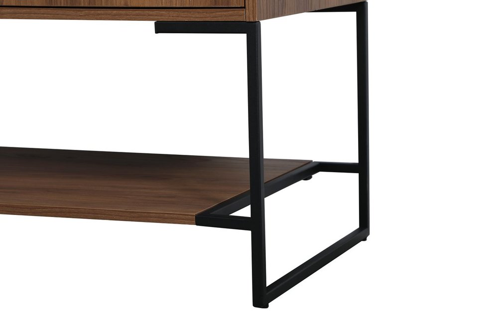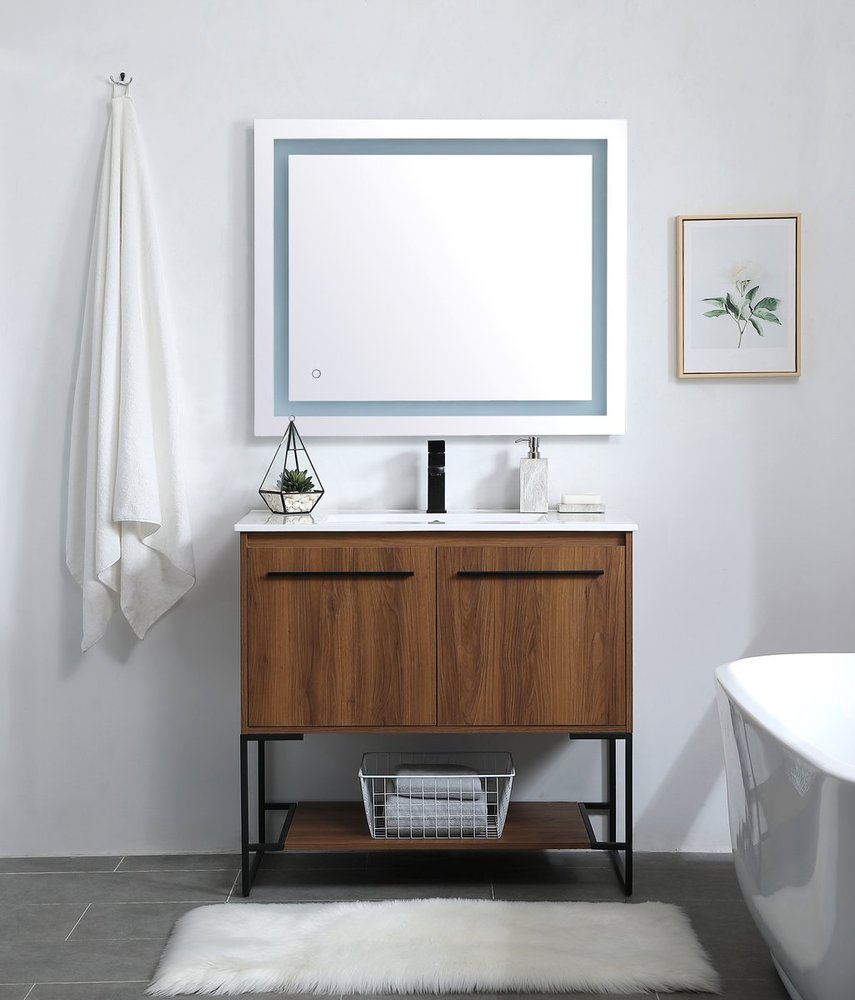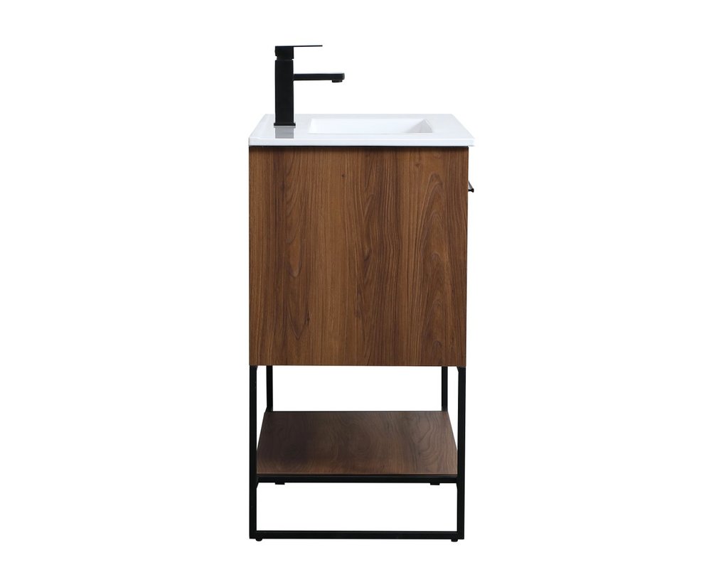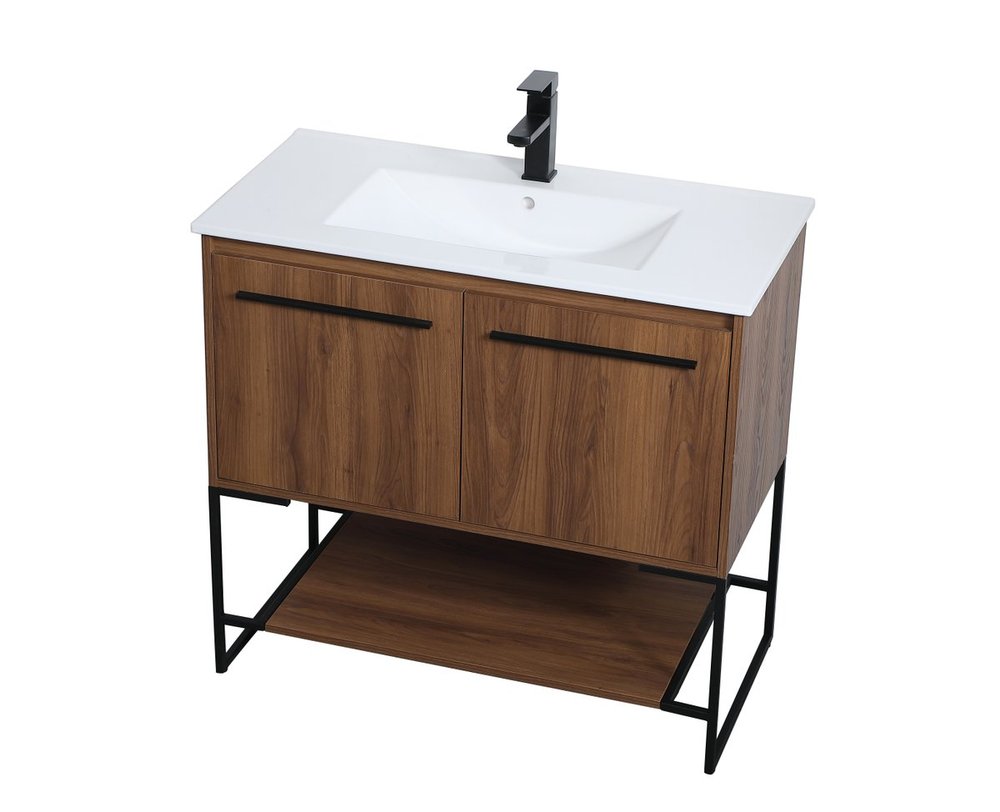 Live in modern comfort with this 36" walnut brown finish vanity. Dressed in a concrete grey and sleek black metal hardware, its contemporary style will have your bathroom or powder room elevated in industrial sophistication. The open shelf at the base and two doors reveal ample storage space for your bathroom essentials and miscellany. Clean lines create its own visual interest, adding trendy looks to your already chic room.