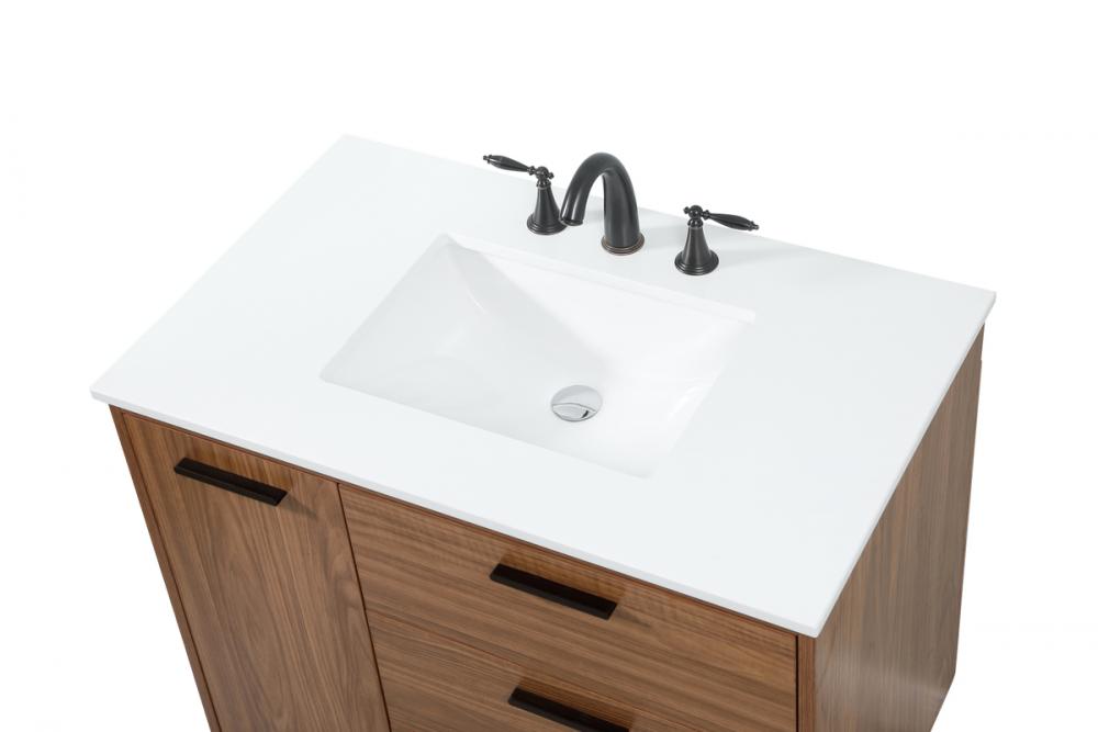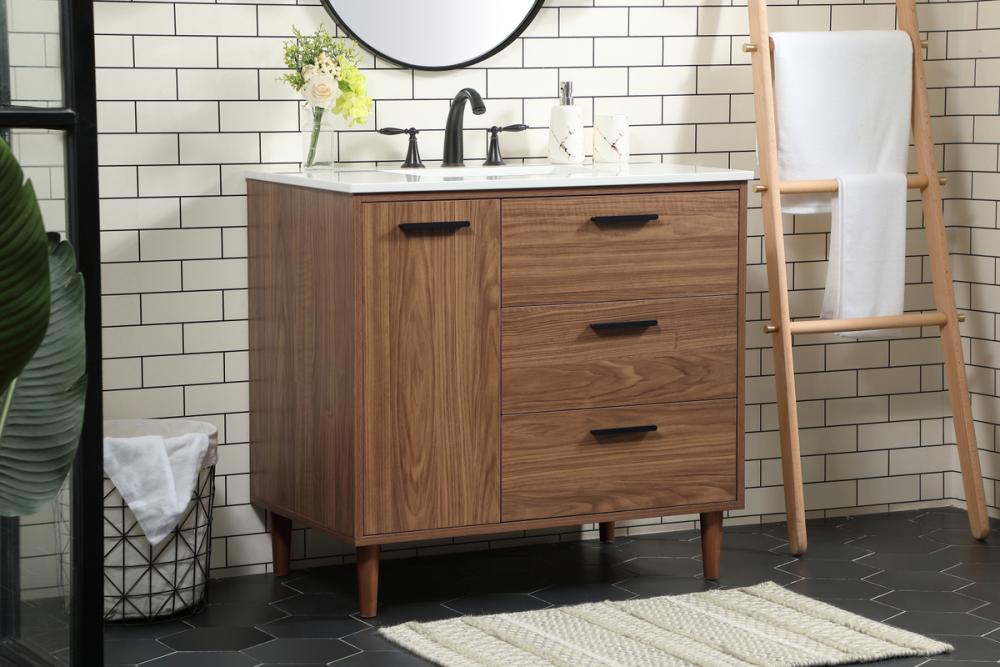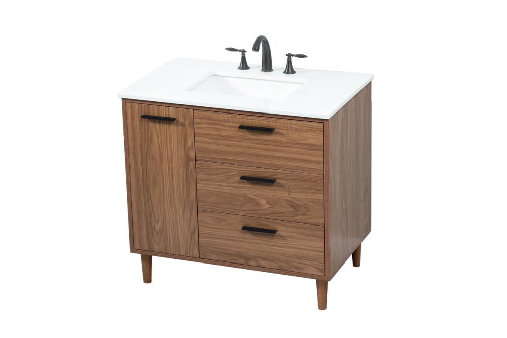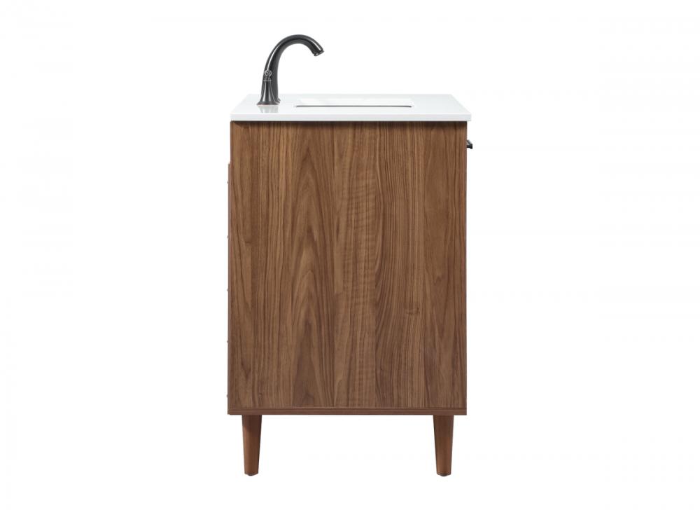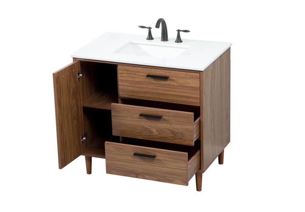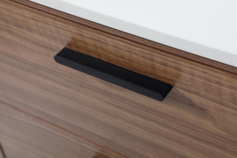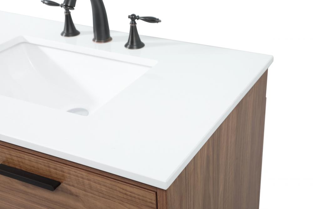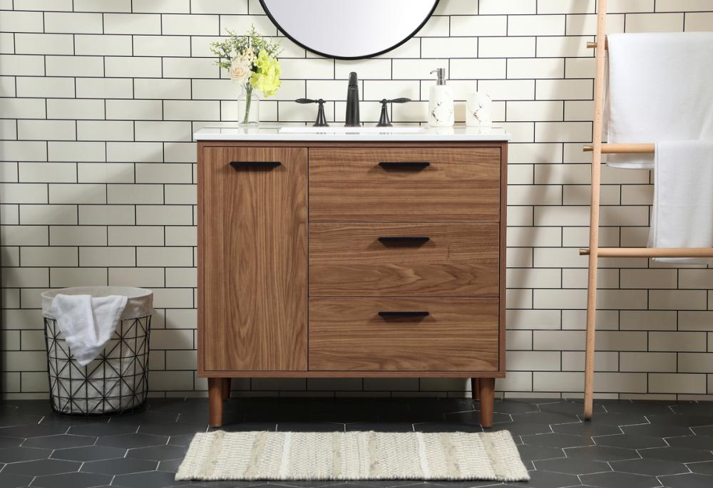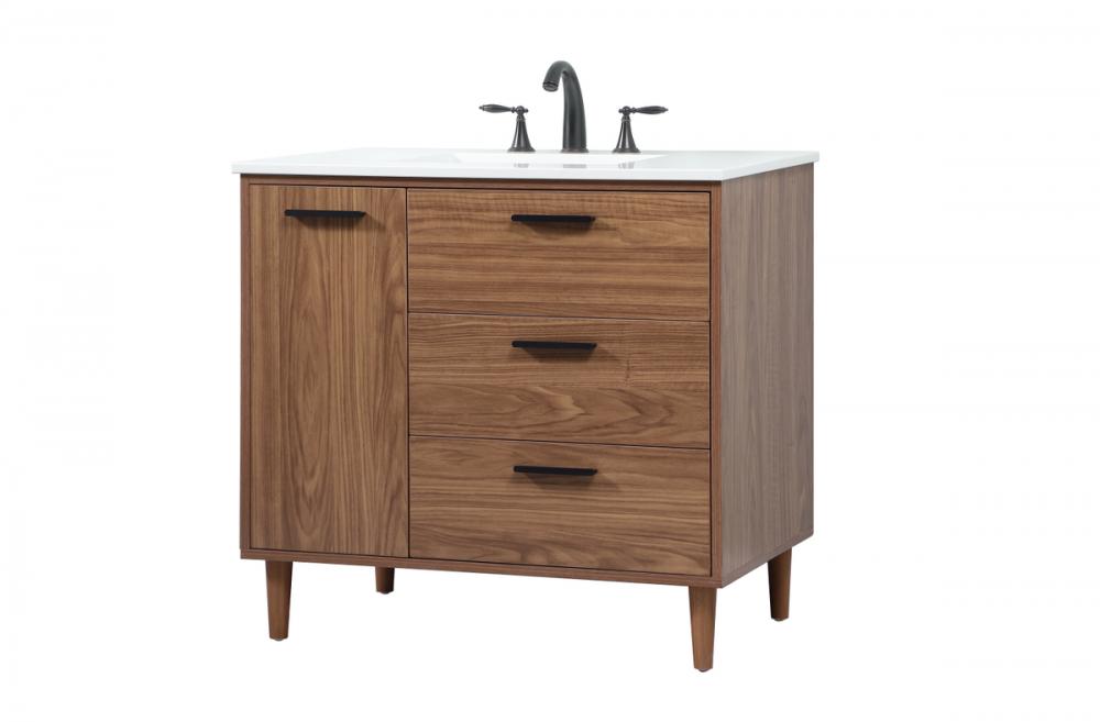 Exquisite modern sophistication is defined with the wood look and black barpulls of this vanity and slender tapered legs. Its length makes it the perfect addition to any sized home, and saves space with its storage area hidden behind the Single cabinet doors and two functional drawers. Topped with a highly durable engineered marble countertop and a porcelain undermount sink, this modern design will become your focal point of your bathroom or powder room. Equipped with soft-closing drawer and doors adds a quiet functional touch.