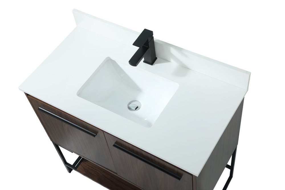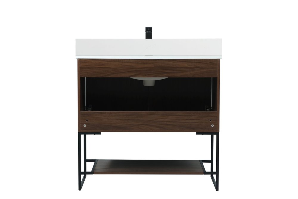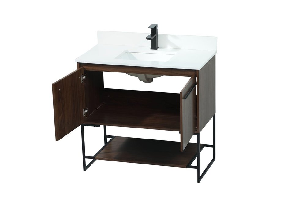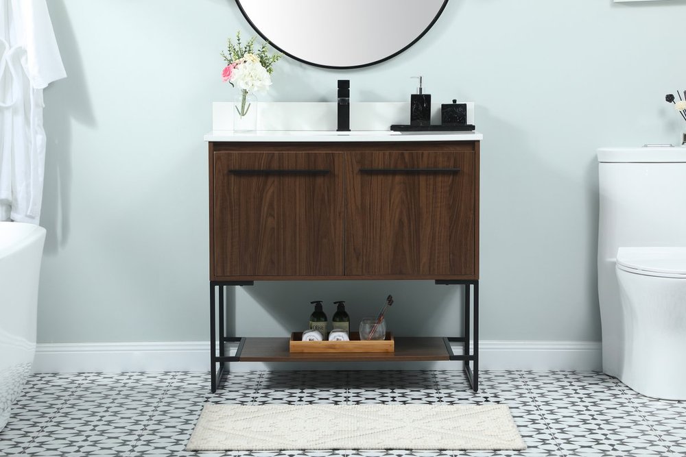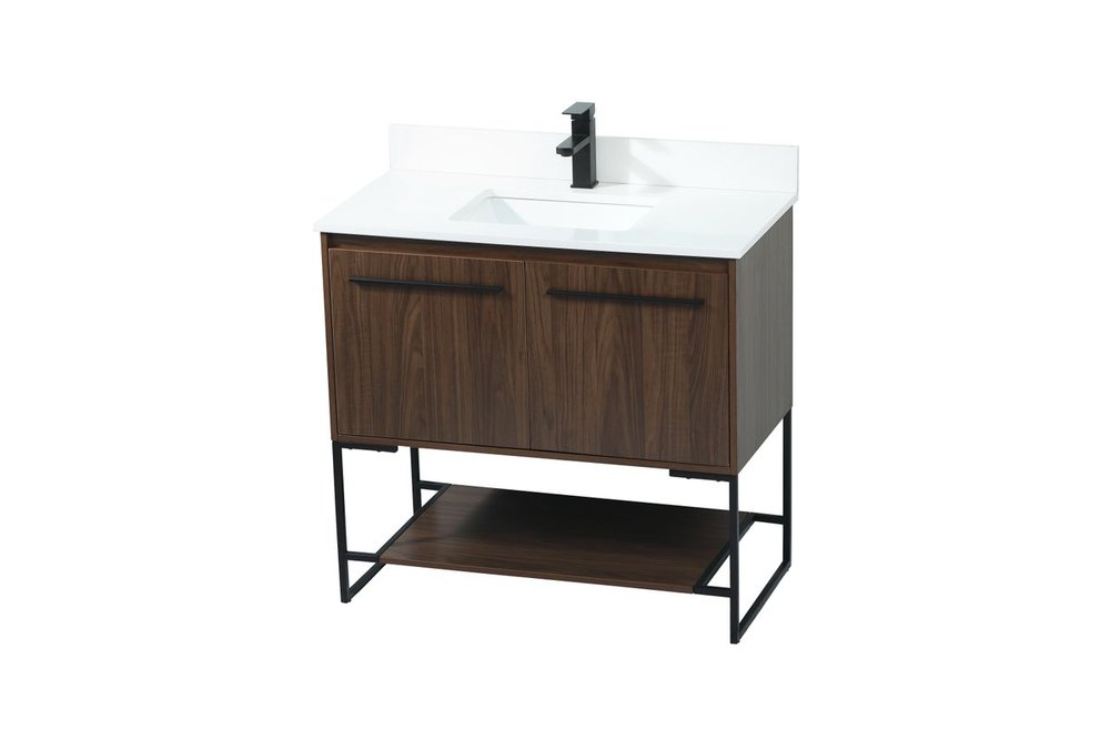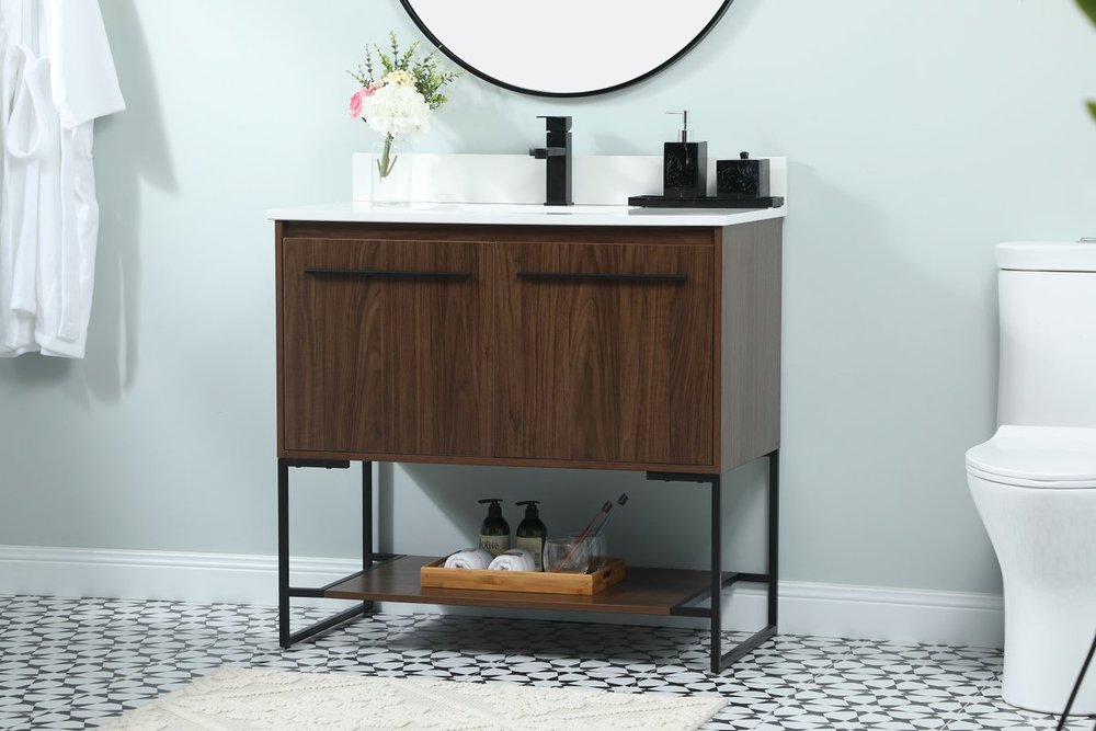 Live in modern comfort with this 36" walnut finish vanity. Dressed in a walnut and sleek black metal hardware, its contemporary style will have your bathroom or powder room elevated in industrial sophistication. The open shelf at the base and two doors reveal ample storage space for your bathroom essentials and miscellany. Clean lines create its own visual interest, adding trendy looks to your already chic room. Comes with a matching backsplash to complete the look and protects your wall.