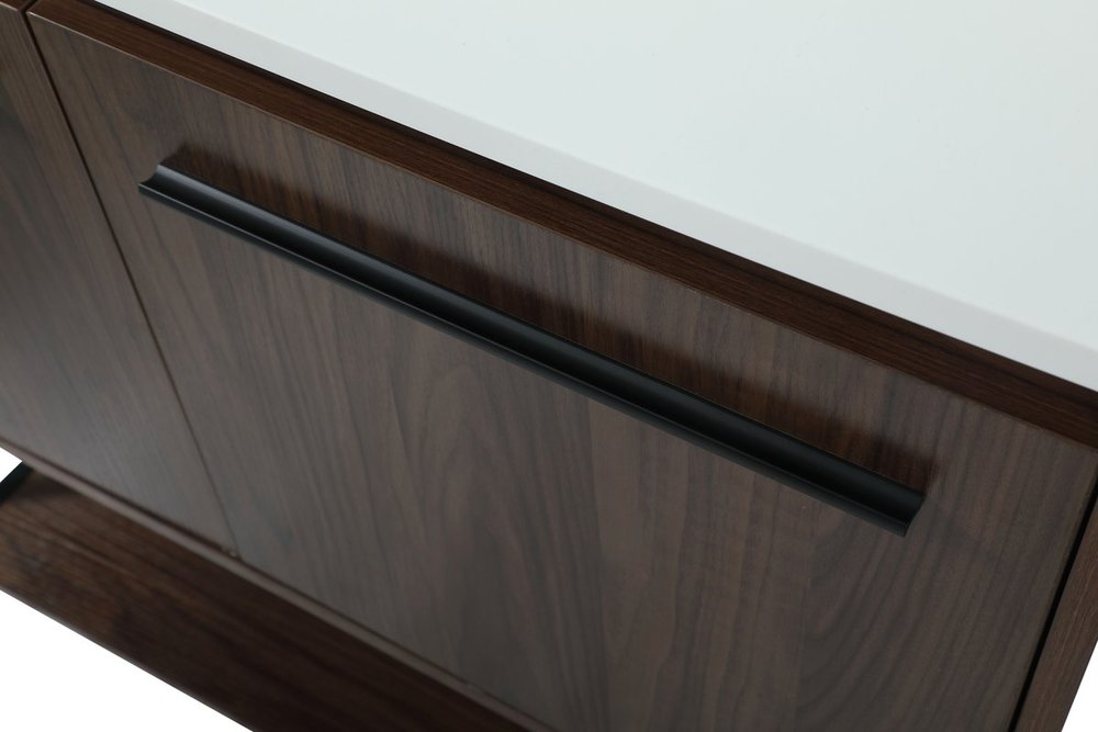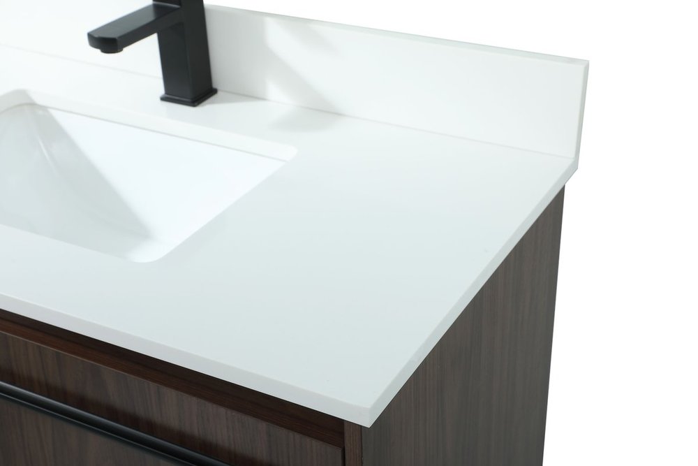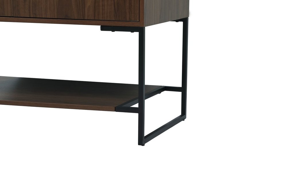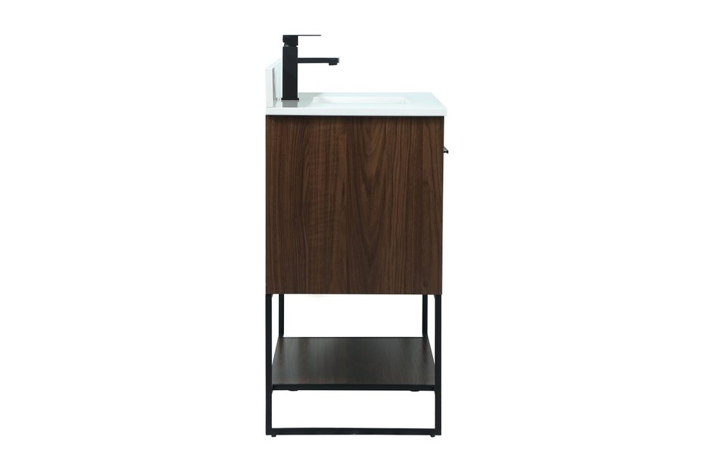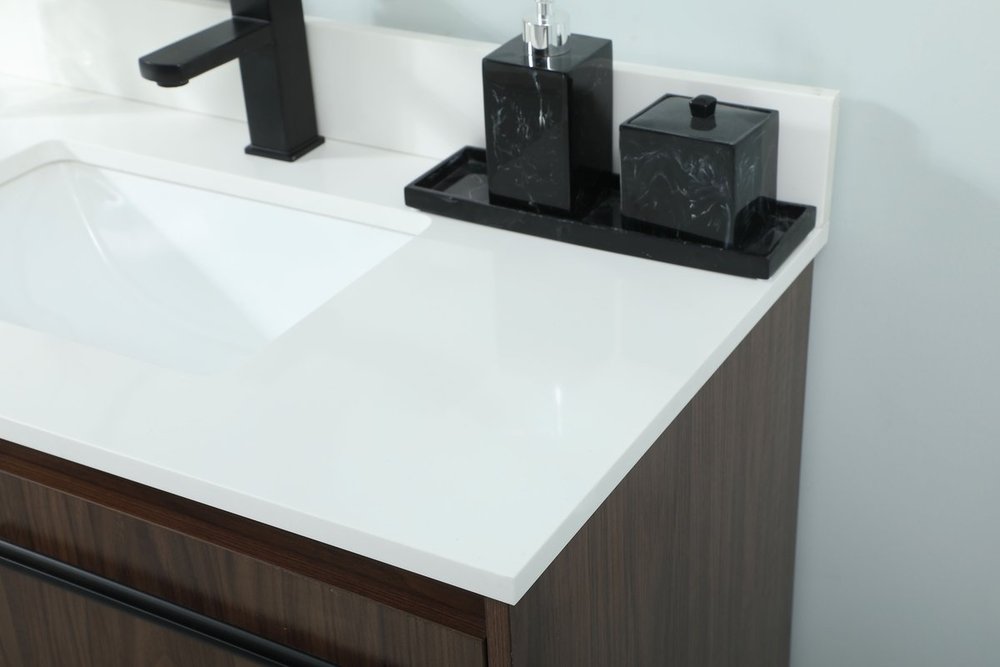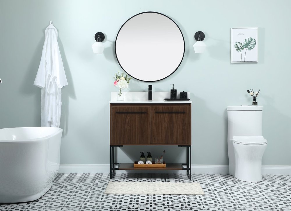 Live in modern comfort with this 36" walnut finish vanity. Dressed in a walnut and sleek black metal hardware, its contemporary style will have your bathroom or powder room elevated in industrial sophistication. The open shelf at the base and two doors reveal ample storage space for your bathroom essentials and miscellany. Clean lines create its own visual interest, adding trendy looks to your already chic room. Comes with a matching backsplash to complete the look and protects your wall.
