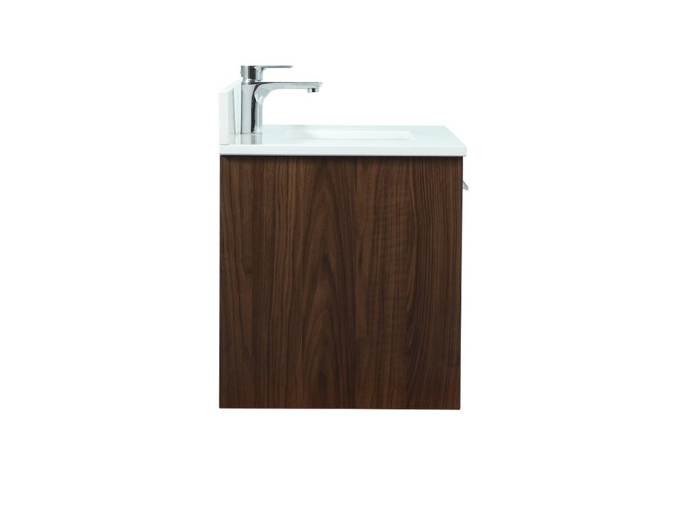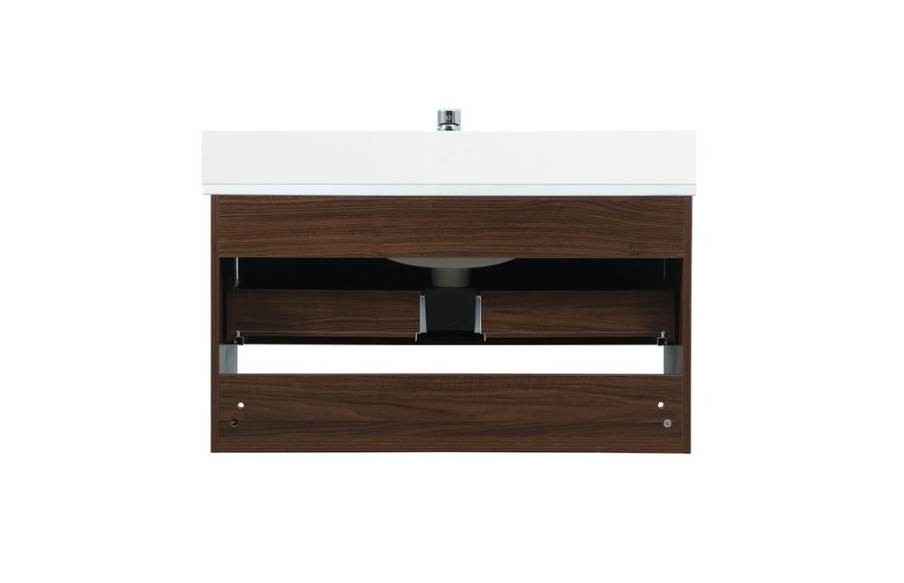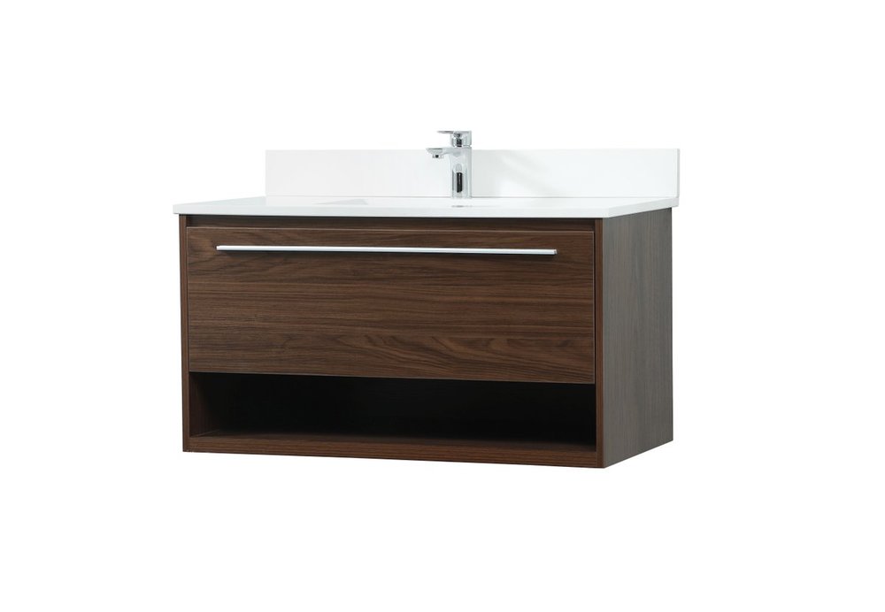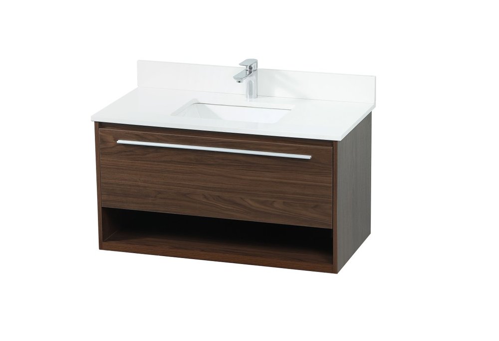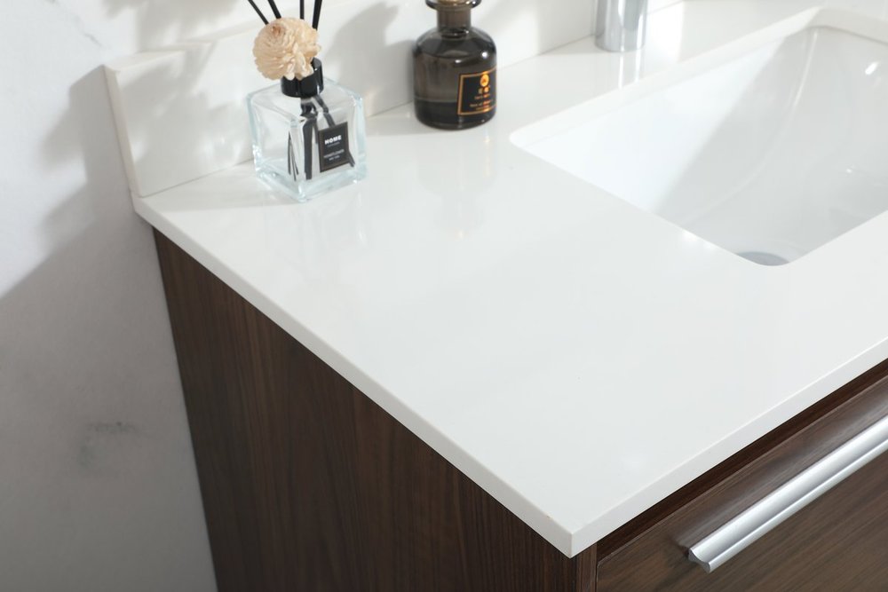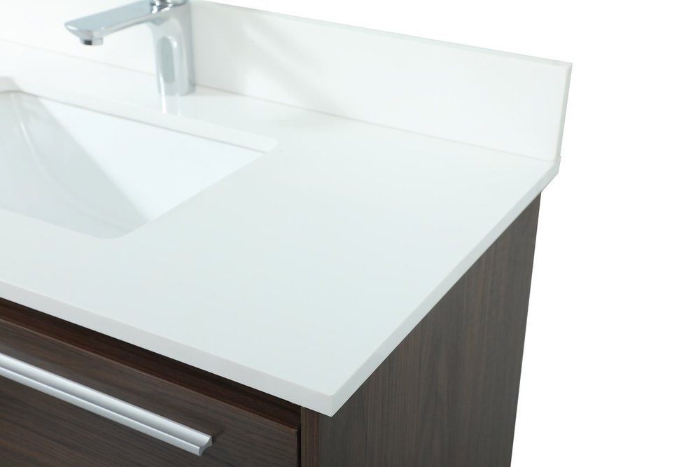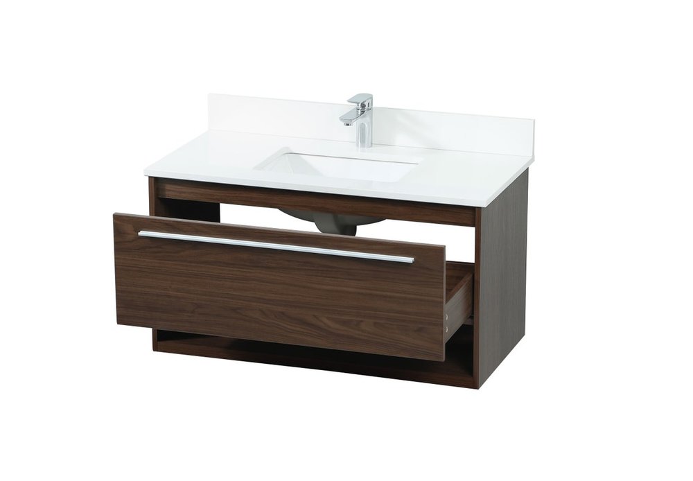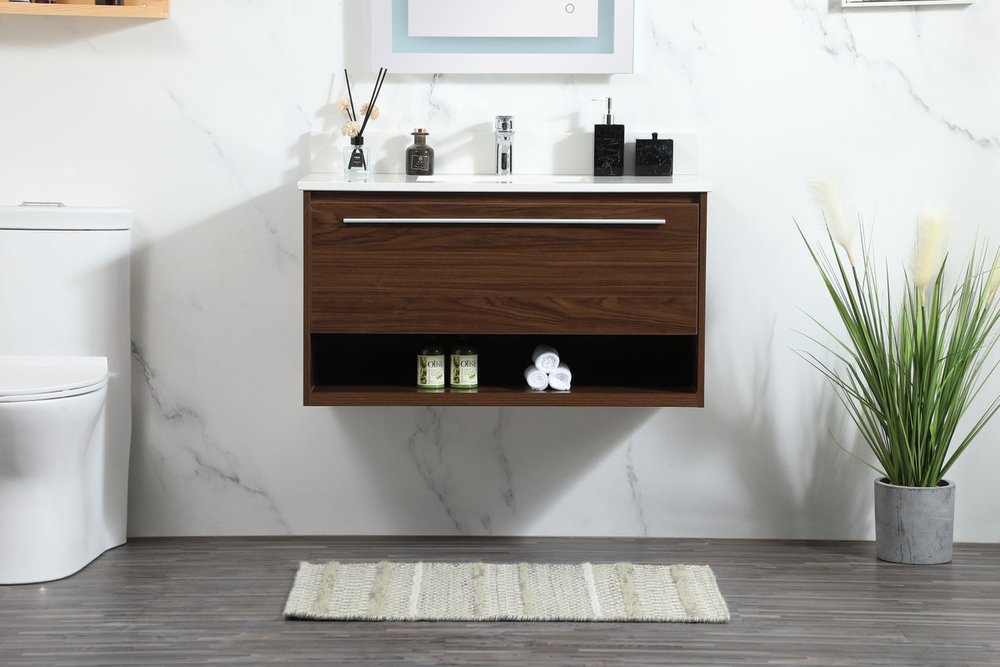 Save space and make your bathroom appear bigger with this floating vanity. Its minimal design will have you in awe, while its clean lines will leave your room feeling fresh and uncluttered. The Single u-drawer pulls out for storage while the open space below allows you to place extra towels or various other essentials. The ivory white engineered marble counter top with porcelain sink adds refined luxe while the aluminum barpull style handle adorn the vanity face. Comes with a matching backsplash to protect your walls.