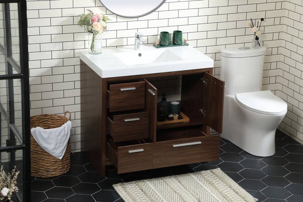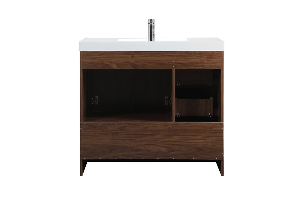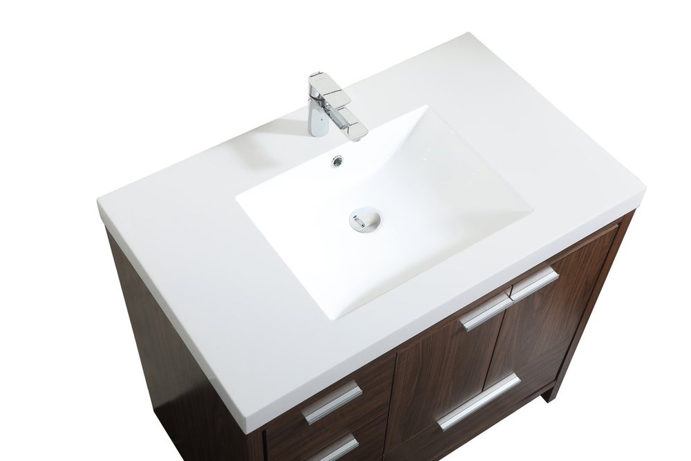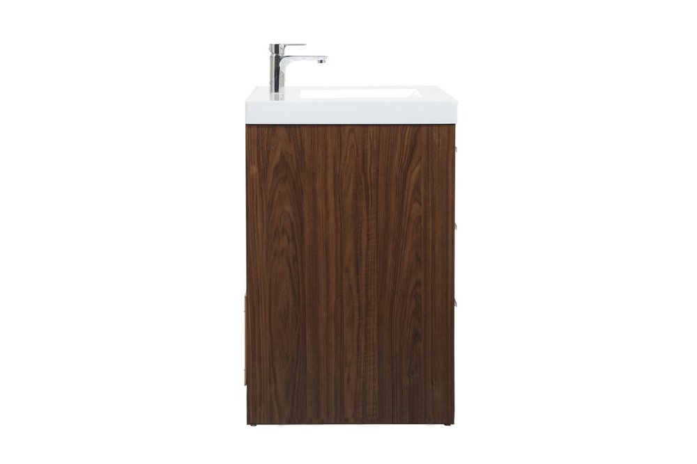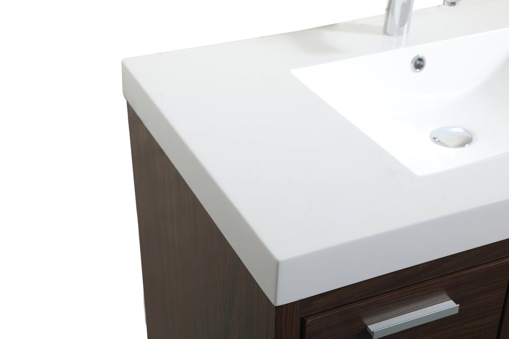 Modern sophistication is defined within the walnut finish and silver barpulls of this vanity. Its length makes it the perfect addition to any sized home, and saves space with its storage area hidden behind the double cabinet doors and one bottom drawers. Topped with a highly durable resin white counter top and an integrated sink, this modern design will add everlasting class to your bathroom and powder room.
