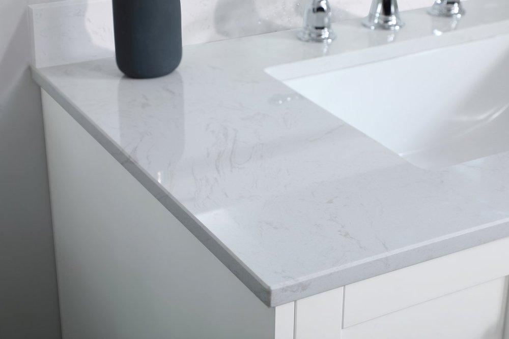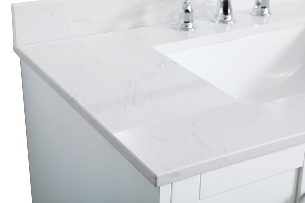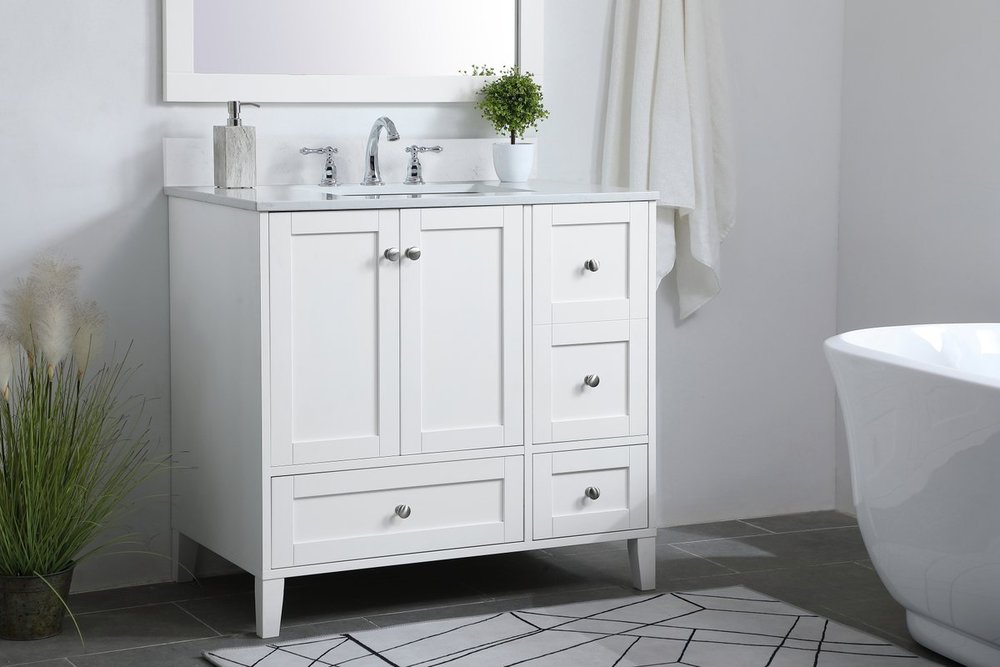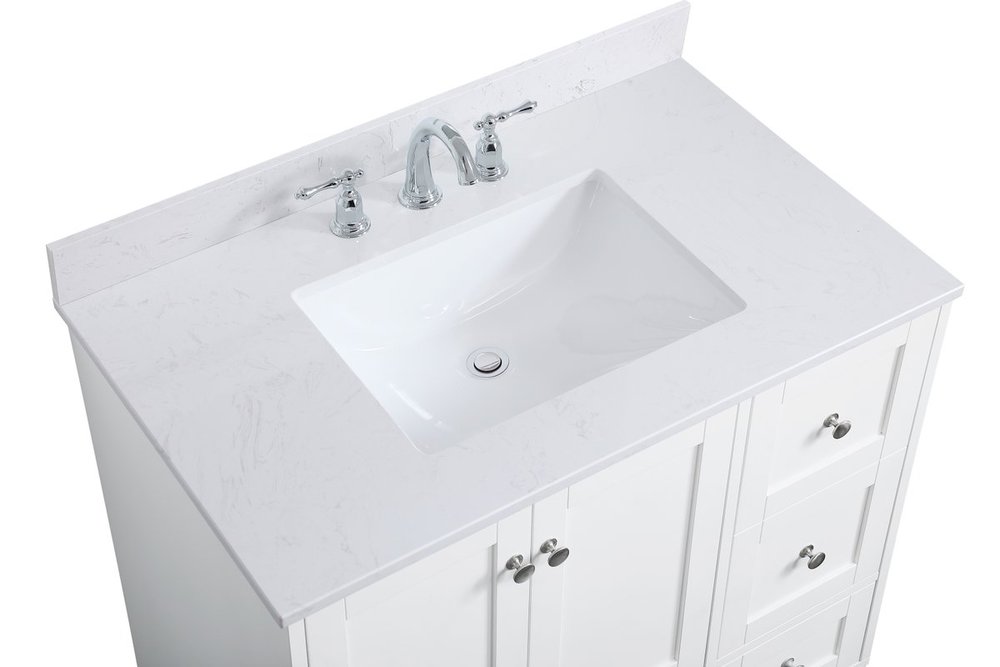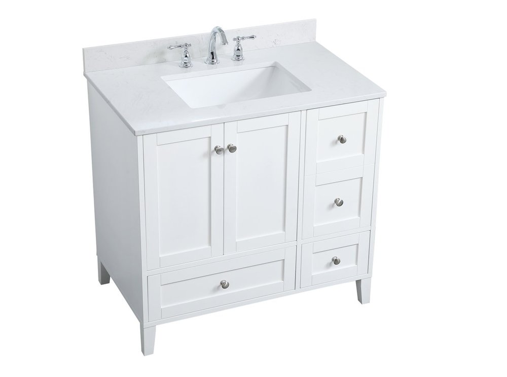 While unassuming, this 36" vanity in a white finish sure knows how to redefine luxury. The sleek brushed nickel knobs adorn the double cabinet doors and 3 drawers which allow you to store your bathroom toiletries and necessities. Standing strong on oblique legs and dressed with a Calacatta engineered marble countertop, this vanity will surely create beauty and casual elegance in your bathroom or powder room. Comes with a matching backsplash to complete the look and protects your wall.