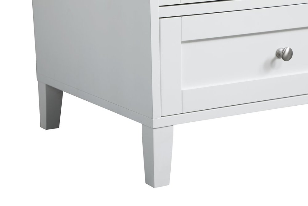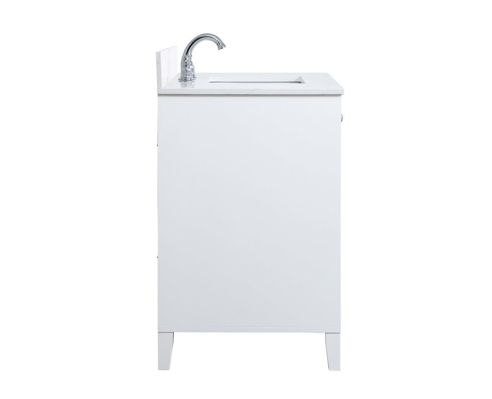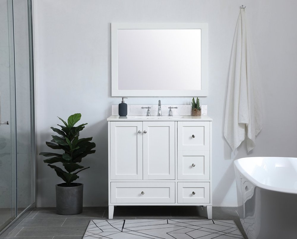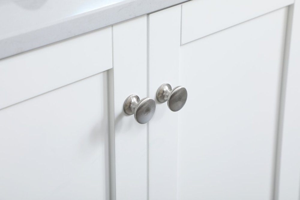 While unassuming, this 36" vanity in a white finish sure knows how to redefine luxury. The sleek brushed nickel knobs adorn the double cabinet doors and 3 drawers which allow you to store your bathroom toiletries and necessities. Standing strong on oblique legs and dressed with a Calacatta engineered marble countertop, this vanity will surely create beauty and casual elegance in your bathroom or powder room. Comes with a matching backsplash to complete the look and protects your wall.