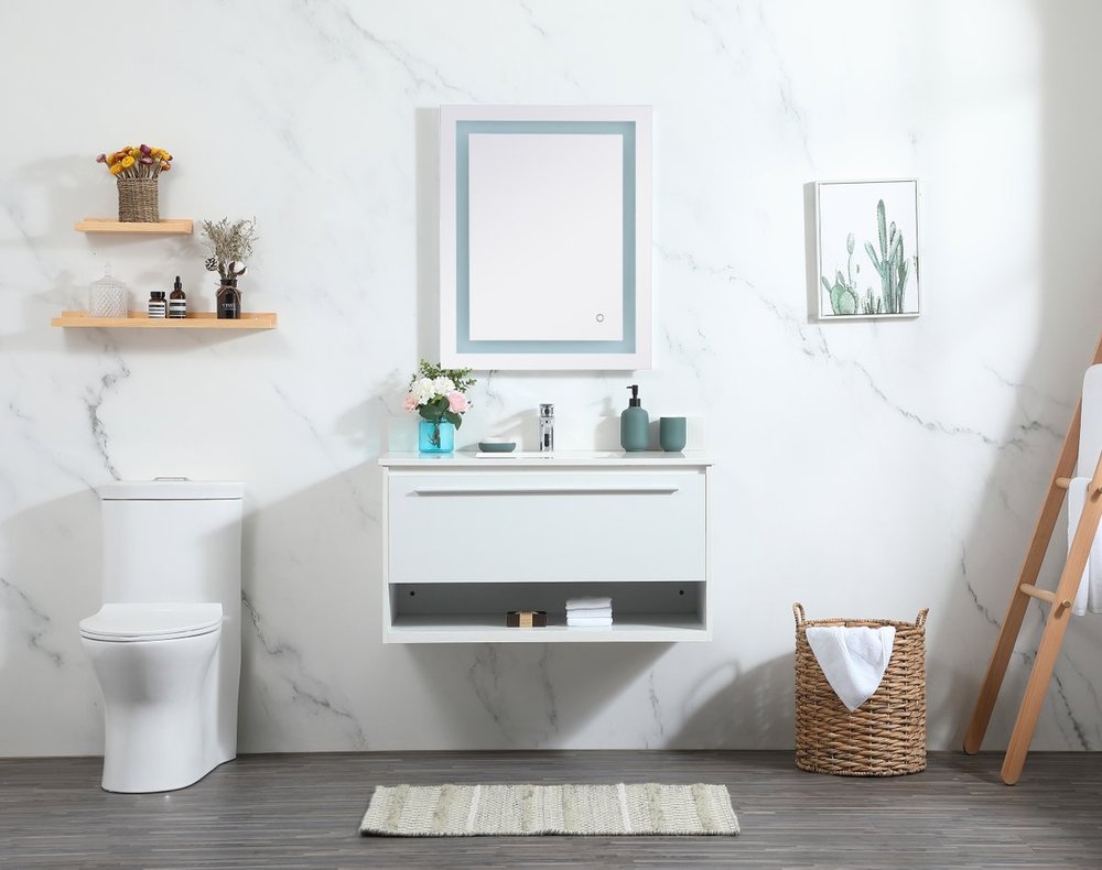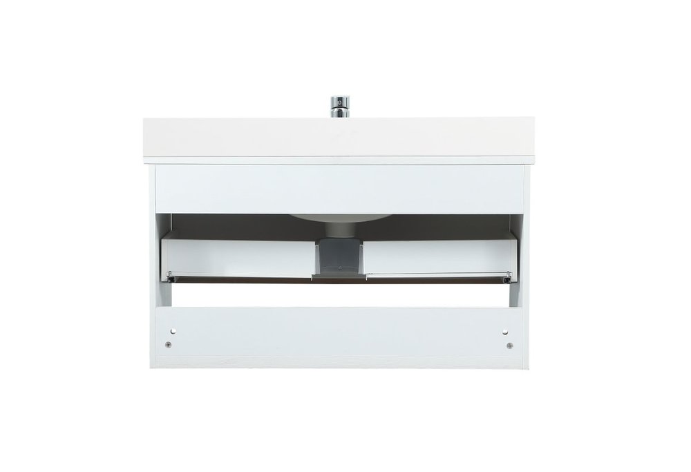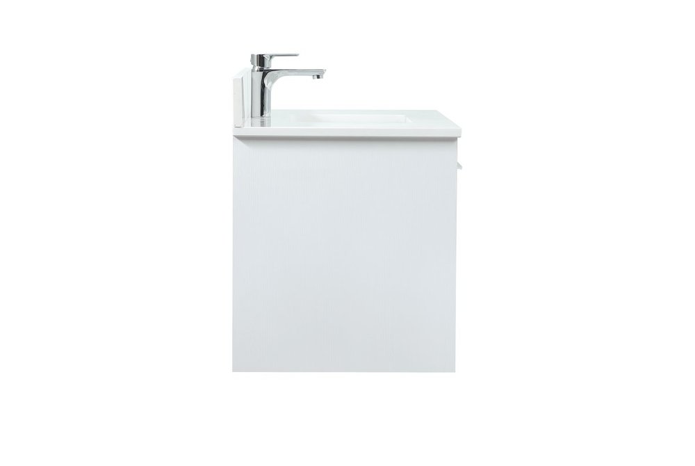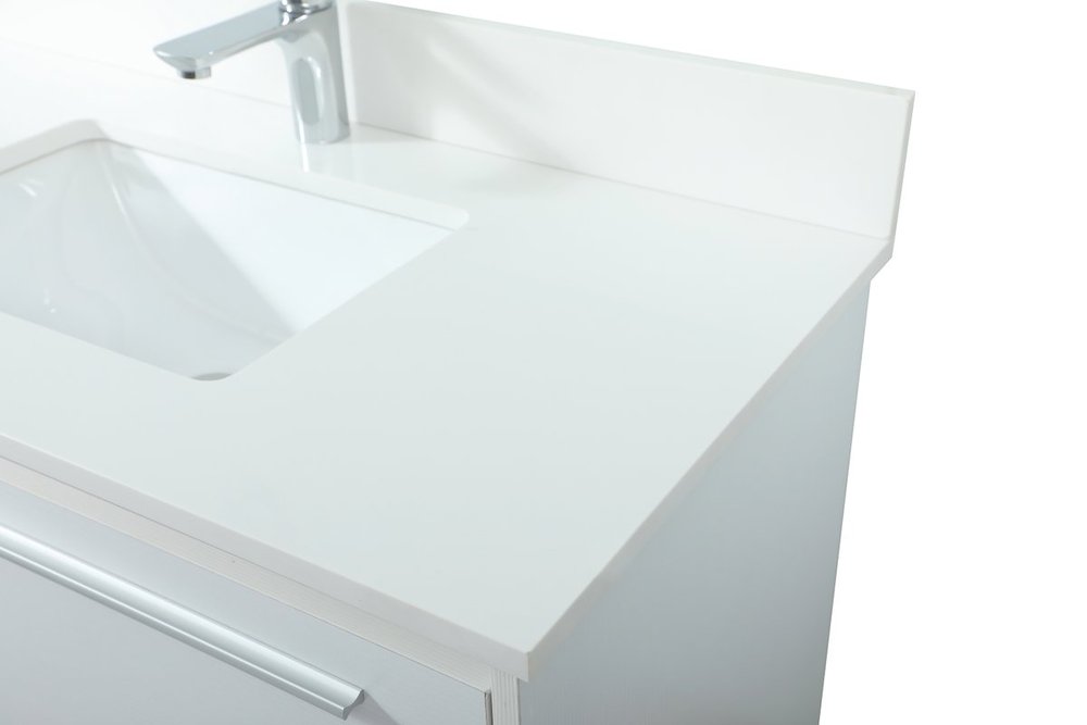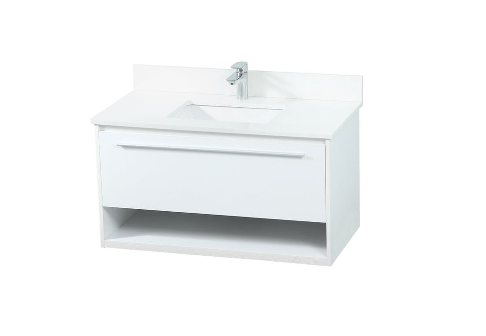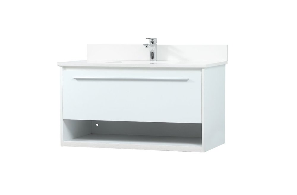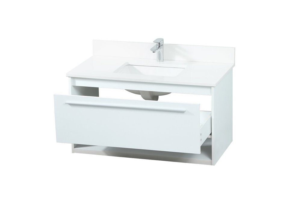 Save space and make your bathroom appear bigger with this floating vanity. Its minimal design will have you in awe, while its clean lines will leave your room feeling fresh and uncluttered. The Single u-drawer pulls out for storage while the open space below allows you to place extra towels or various other essentials. The ivory white engineered marble counter top with porcelain sink adds refined luxe while the aluminum barpull style handle adorn the vanity face. Comes with a matching backsplash to protect your walls.