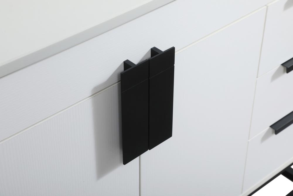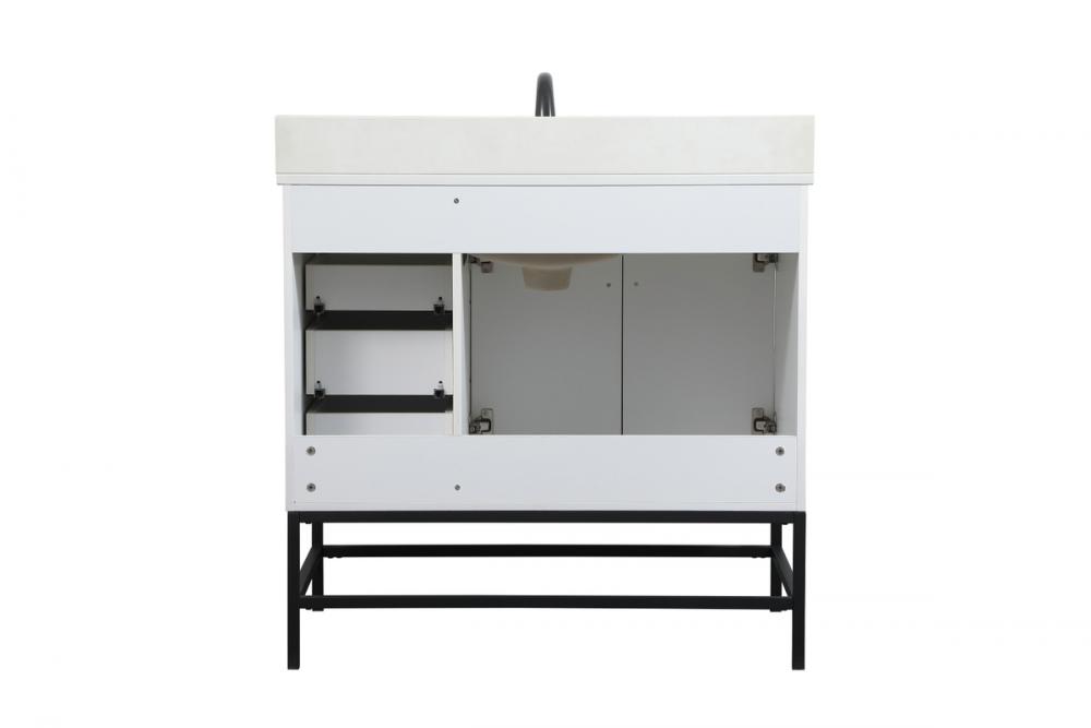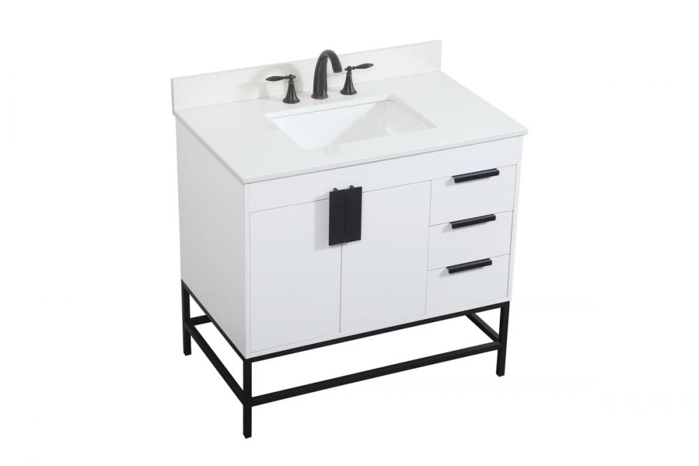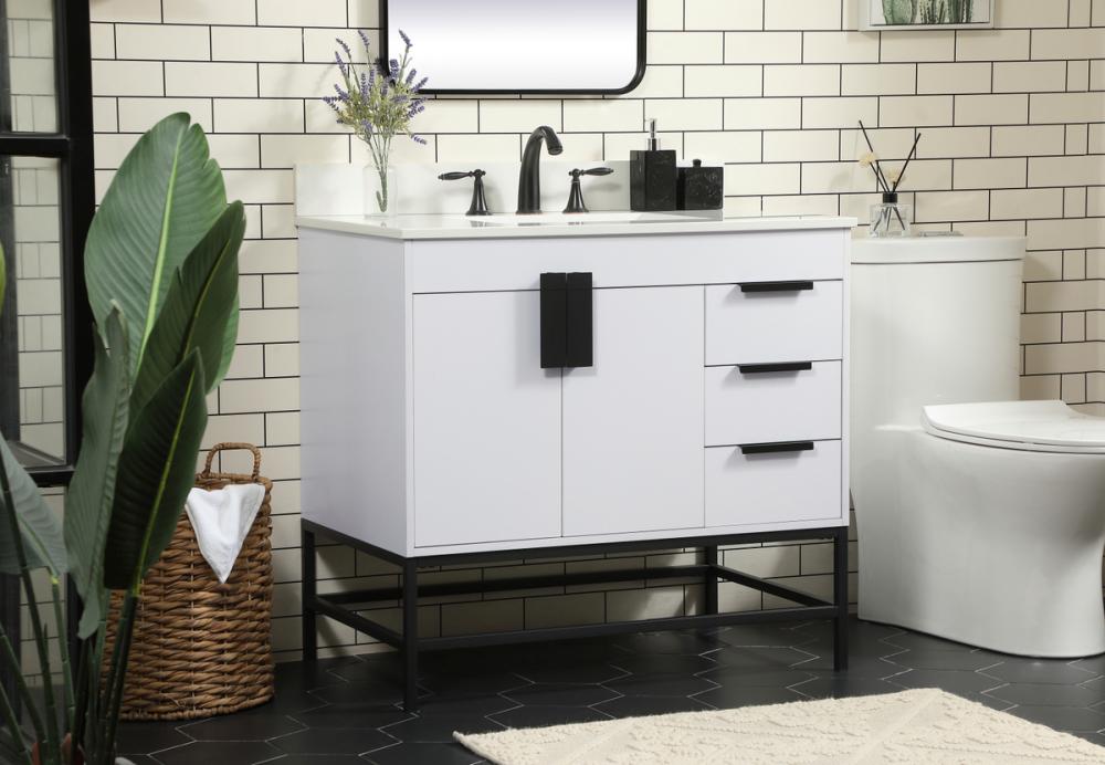 This vanity is a sleek-looking piece of bathroom furniture that is easy to incorporate into your design scheme. The cabinet features a smooth door panel with an oversized steel handle and soft close hinges provide ample room for accessories. Constructed of engineered wood, the powder-coated metal rod legs are an urban industrial look that we love. Minor assembly of the metal legs needed to get this vanity up and running. Comes with a matching backsplash to complete the look and protects your wall.