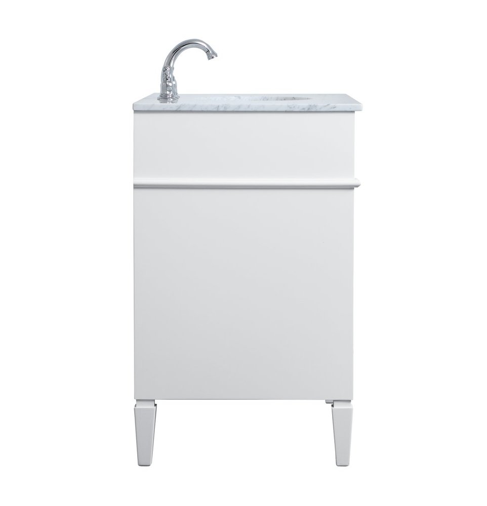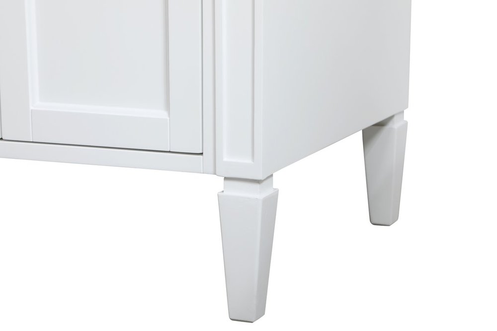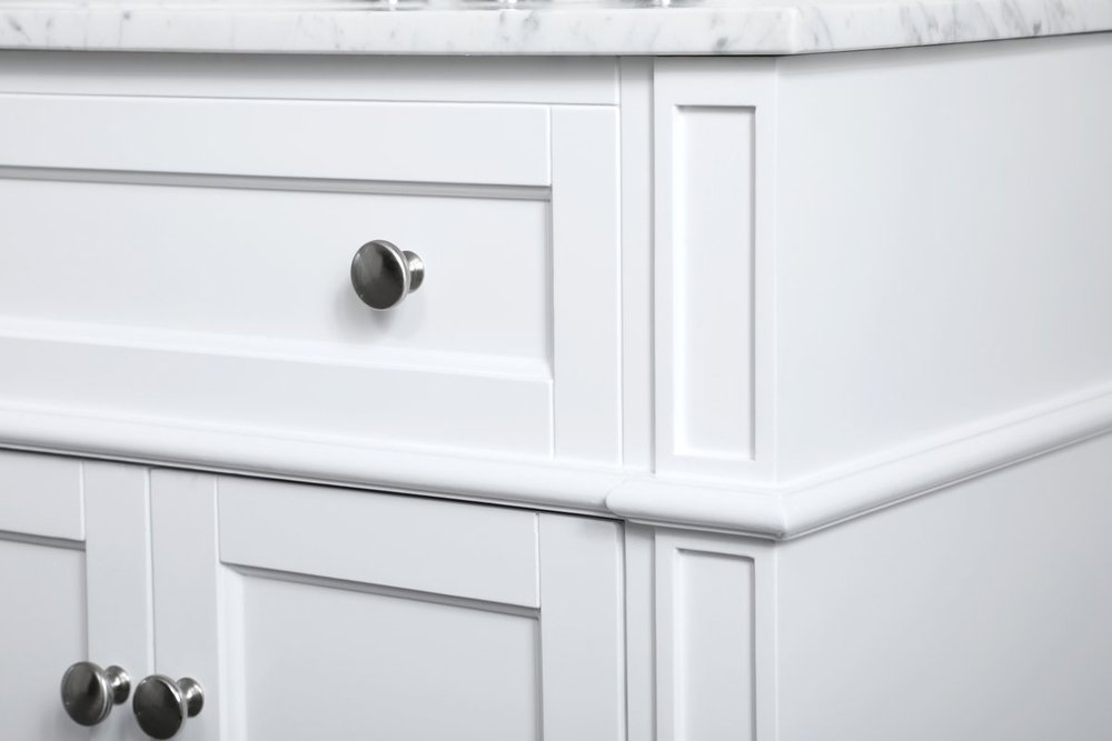 Modern sophistication is defined within the urbane white finish and brushed steel knobs of this vanity. Its length makes it the perfect addition to any sized home, and saves space with its storage area hidden behind the double cabinet doors and 3 side drawers. Topped with a Carrara white marble counter top and a porcelain sink, this design will add everlasting class to your bathroom and powder room.