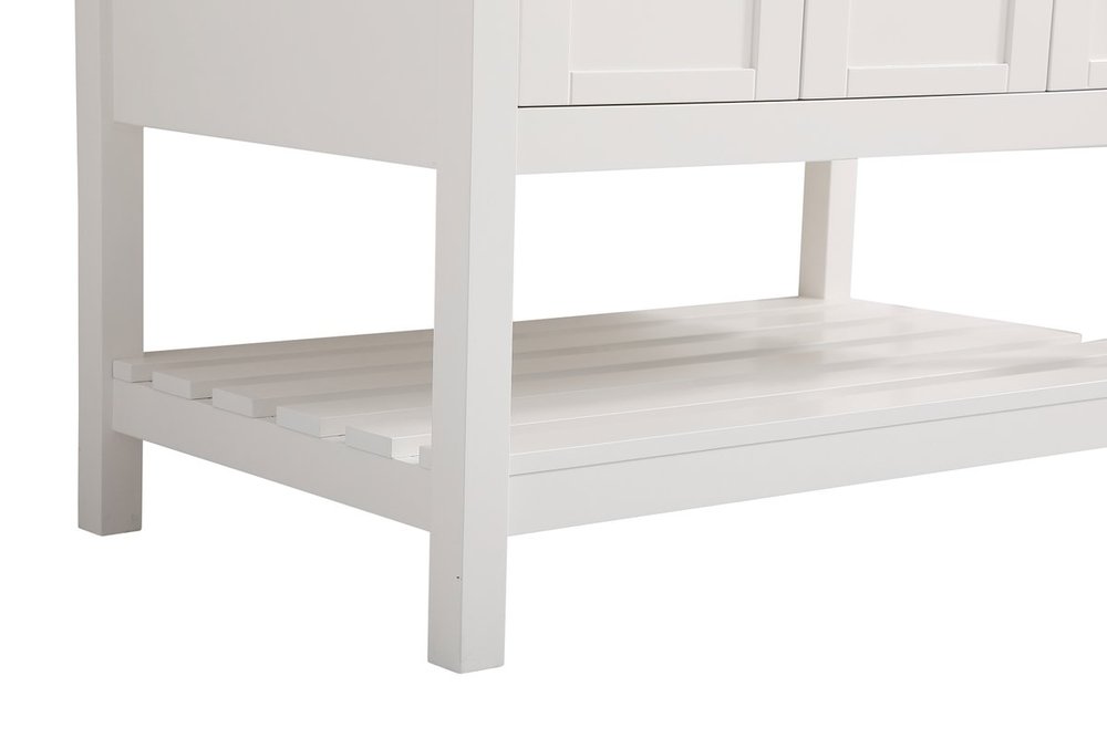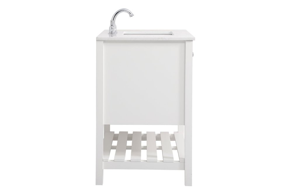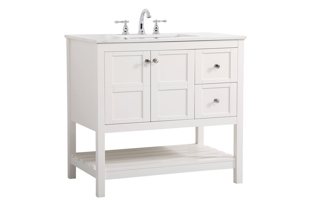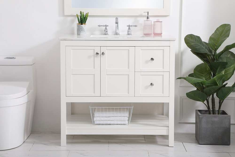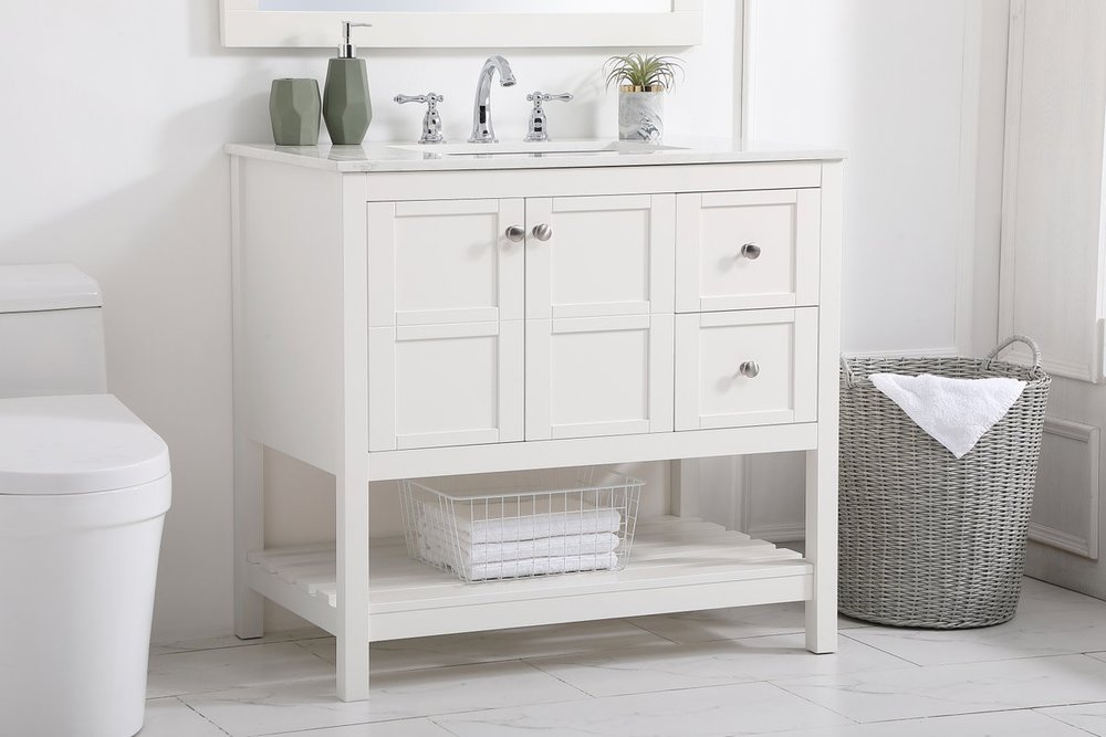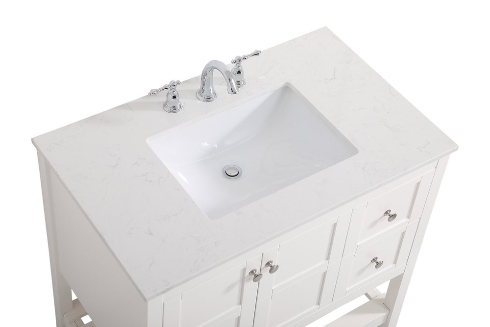 The subtle beauty of the Theo collection 36" vanity in a white finish exudes comfortable luxury. Its modern, yet traditional beauty will surely dress up your bathroom or powder room without any fuss. The white stone countertop and porcelain undermount sink shows quiet opulence, and the legs support upright without fail. Brushed Nickel hardware complements the trendy white finish, with pulls adorning the two cabinet doors and two drawers, showcasing ample storage space within. Slated shelf allows for additional space to organize your towels. Whether this vanity is in your bathroom or for guests, its presence will surely elevate the aesthetics of your room.