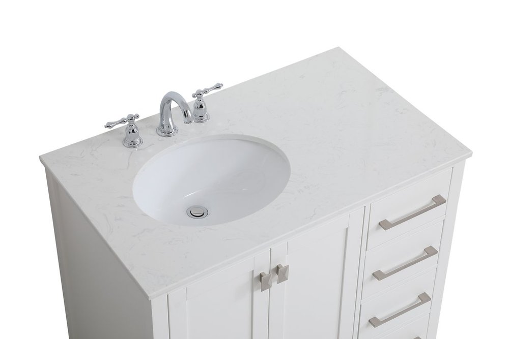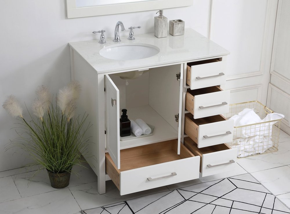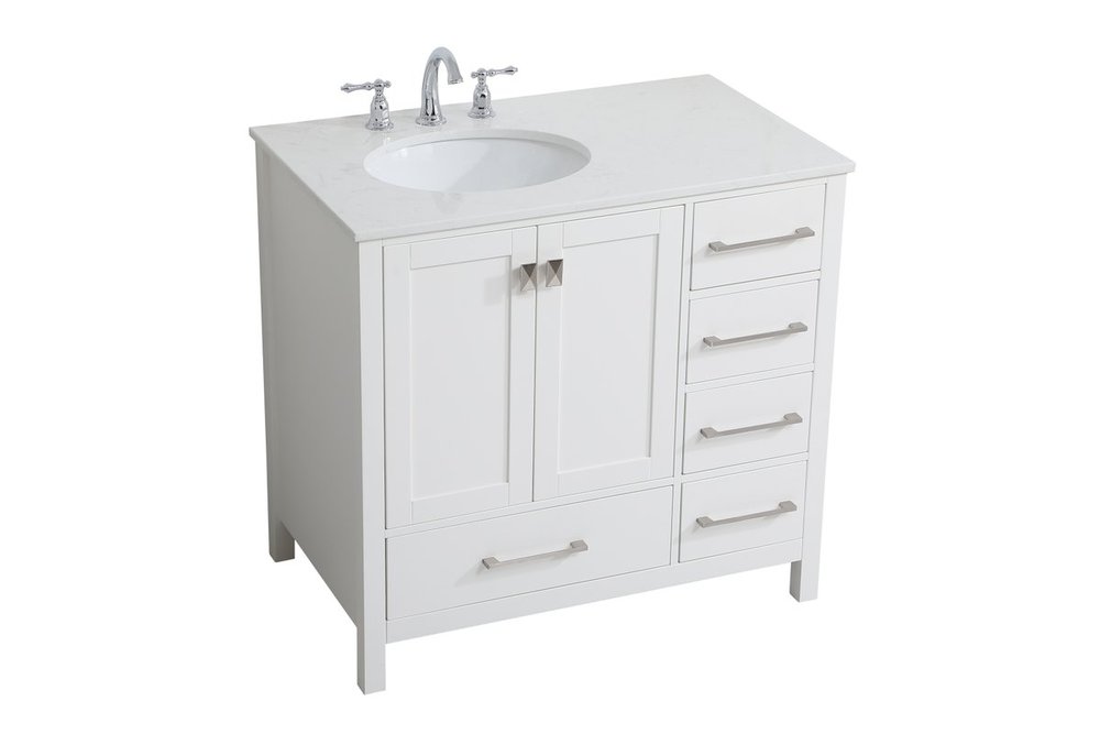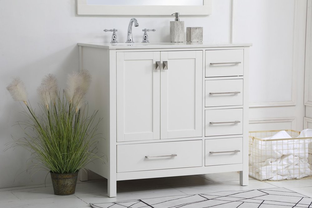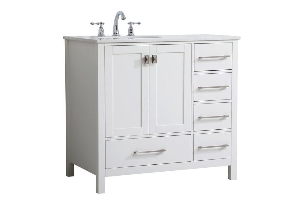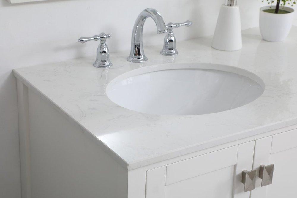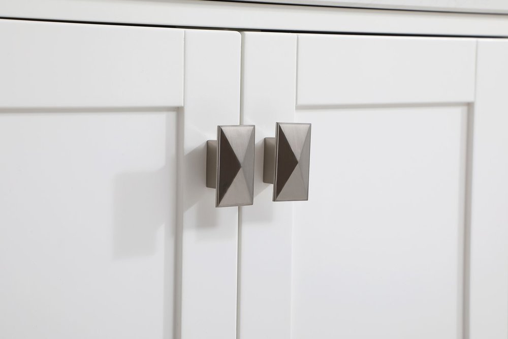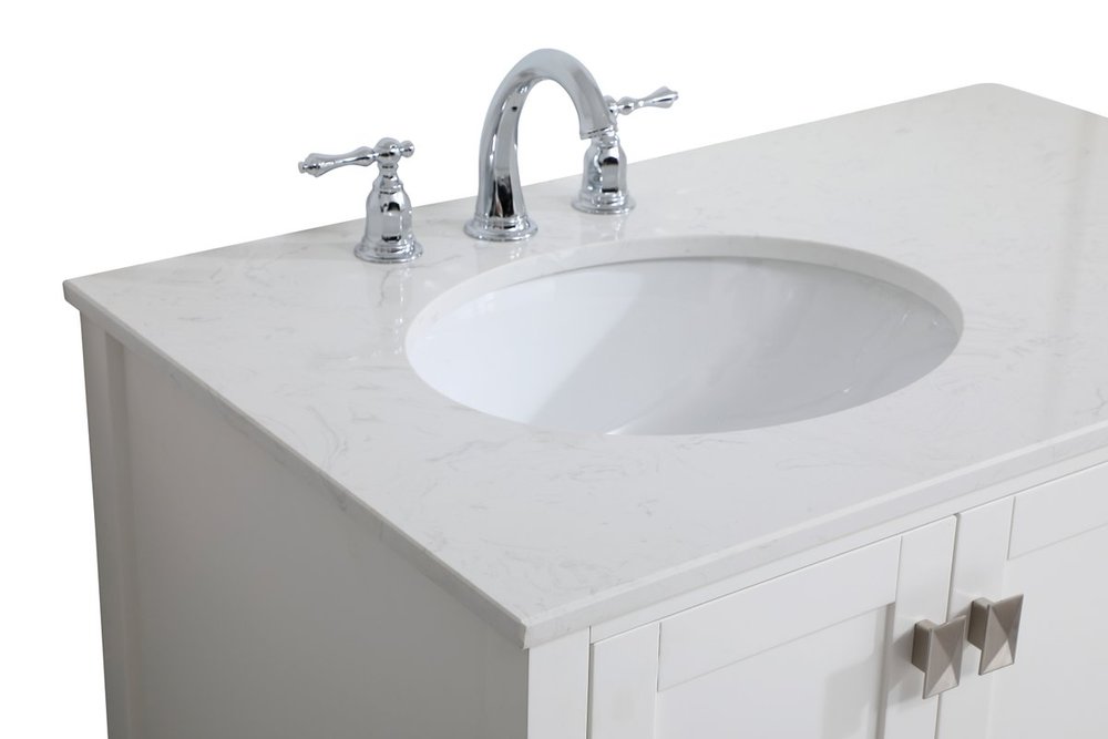 Never compromise beauty--the Irene collection stunning vanity in a white finish will add lovely sophistication and complement any bathroom or powder room, while utilizing its charm and function to provide you with ample storage spaces. Brushed nickel pulls gently adorn the minimalist cabinet doors and drawers at the base, allowing for you to store away your bathroom essentials. The calacatta engineered marble countertop, porcelain undermount sink, dignified subtle engravings on the side edges, and squared legs all come together to create contemporary beauty. Work with your space, and design a beautiful room, no matter the size.