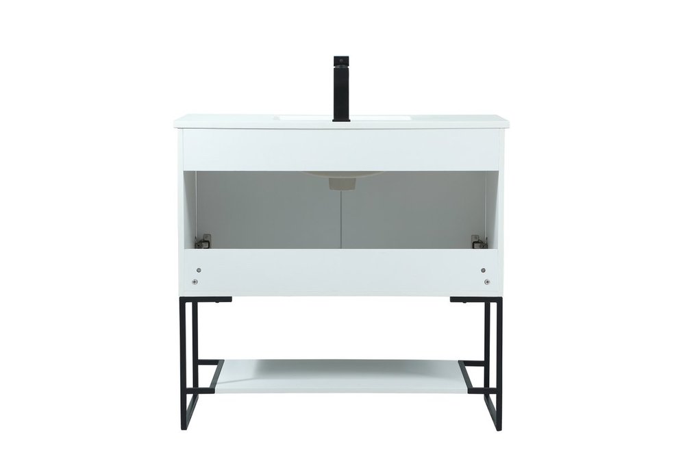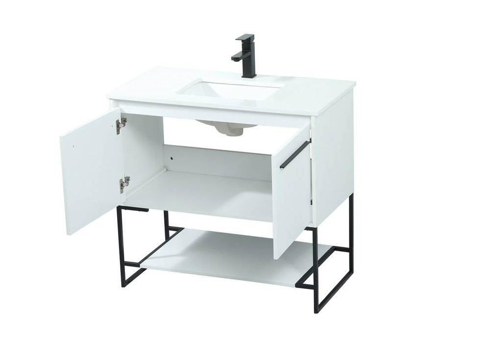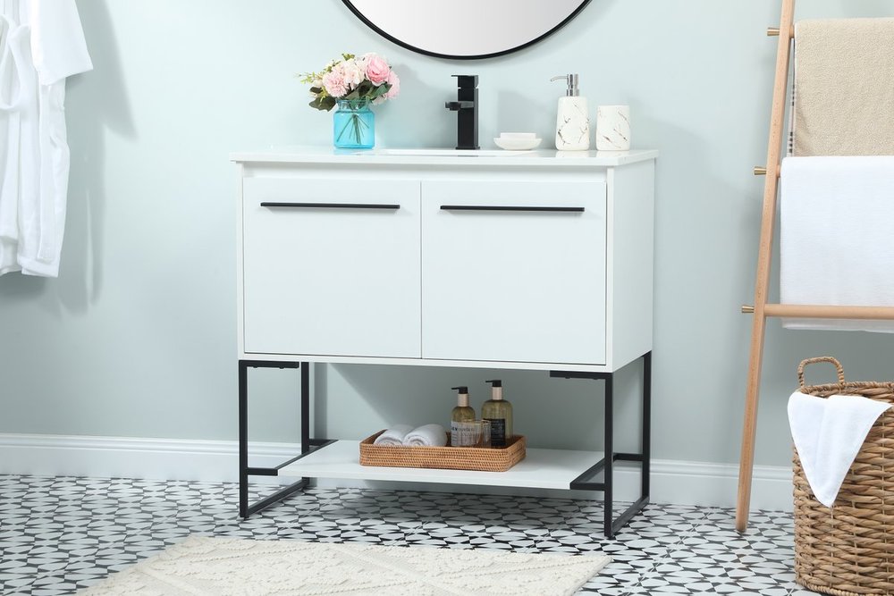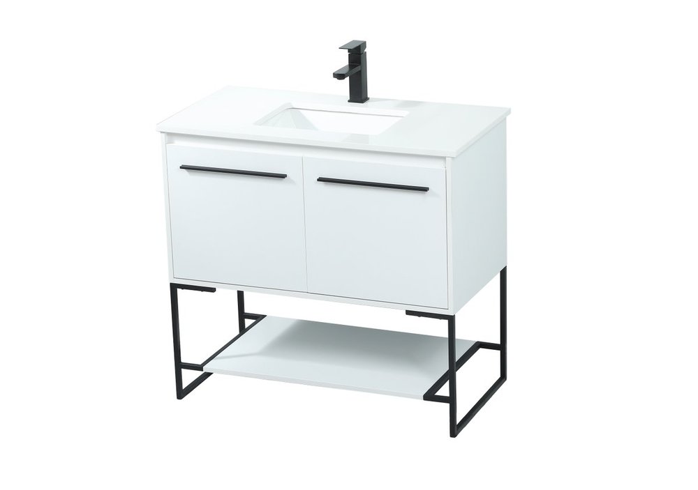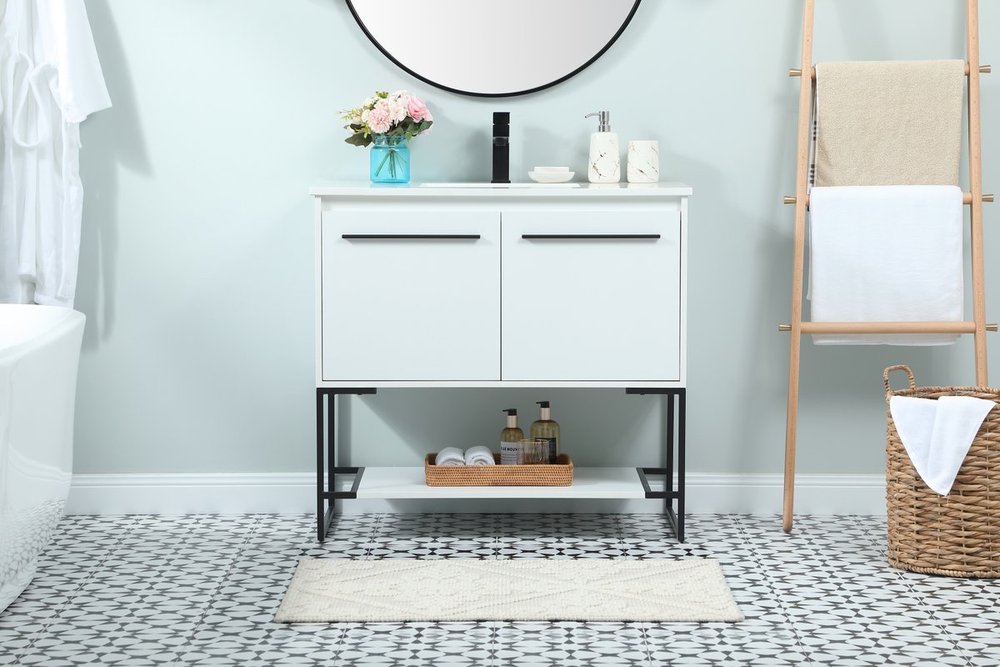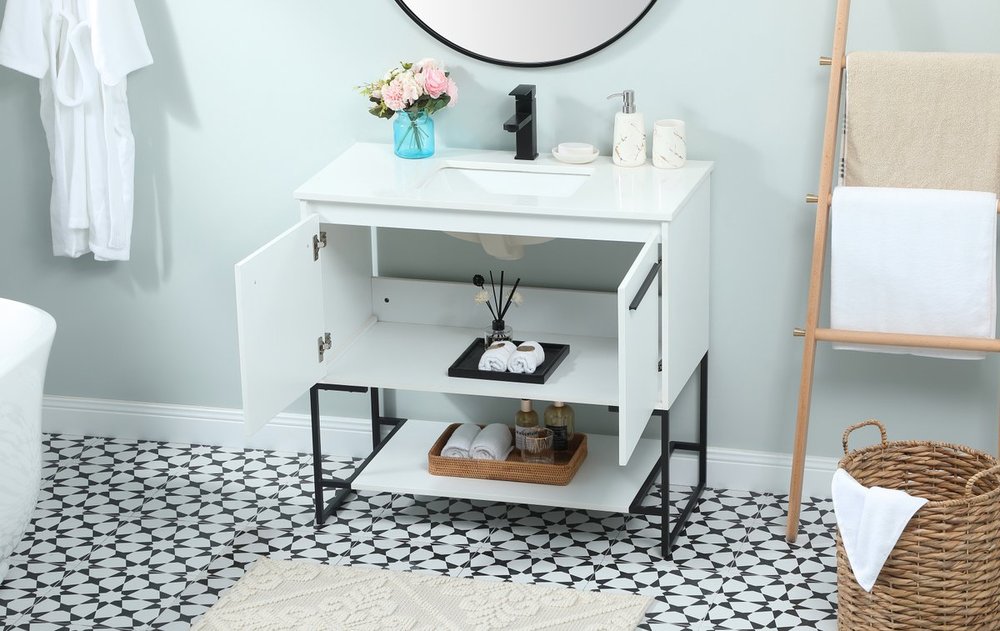 Live in modern comfort with this 36" white finish vanity. Dressed in a white and sleek black metal hardware, its contemporary style will have your bathroom or powder room elevated in industrial sophistication. The open shelf at the base and two doors reveal ample storage space for your bathroom essentials and miscellany. Clean lines create its own visual interest, adding trendy looks to your already chic room.