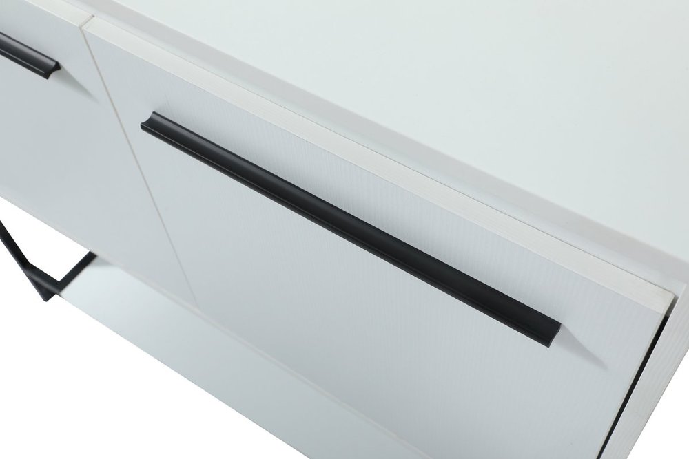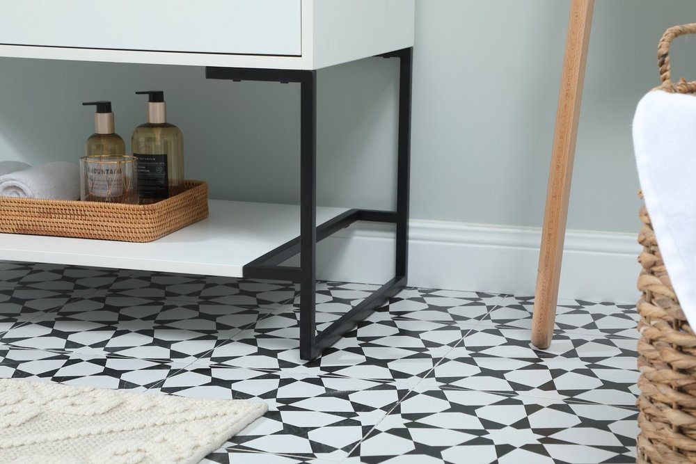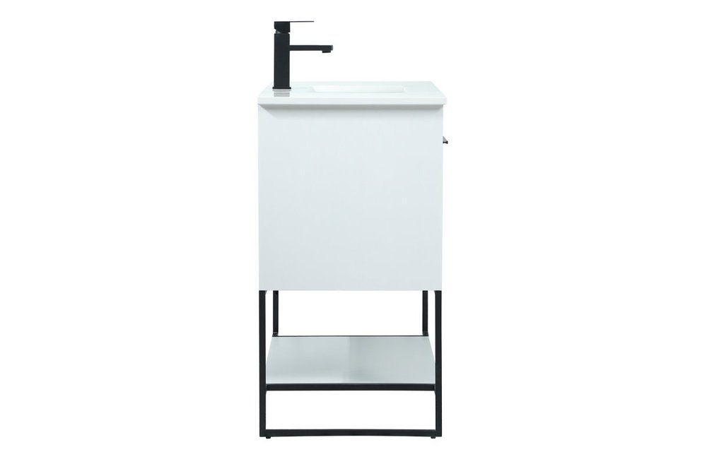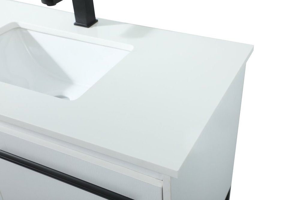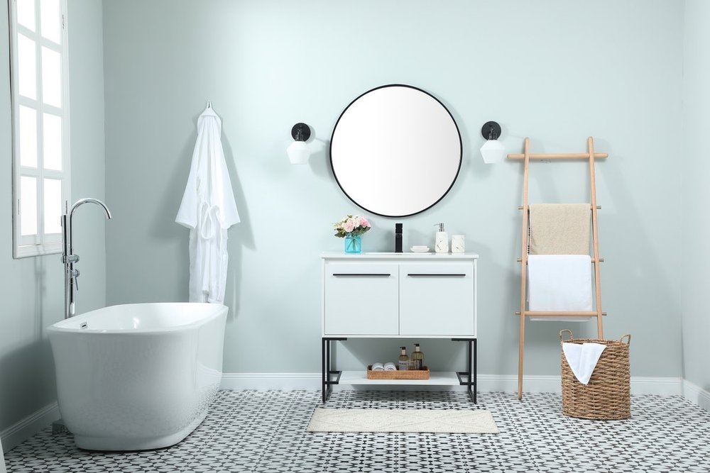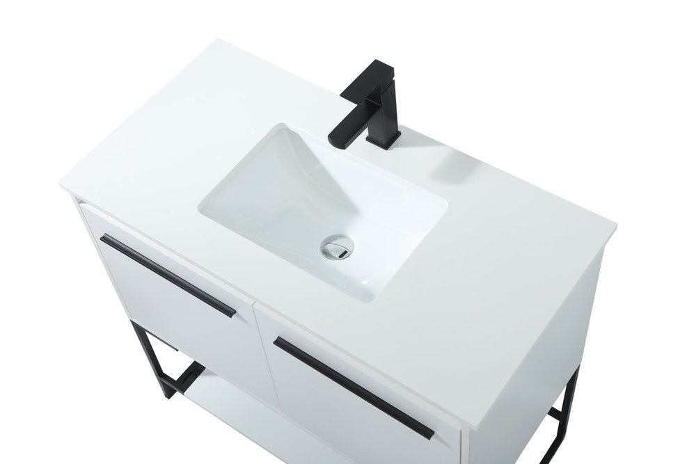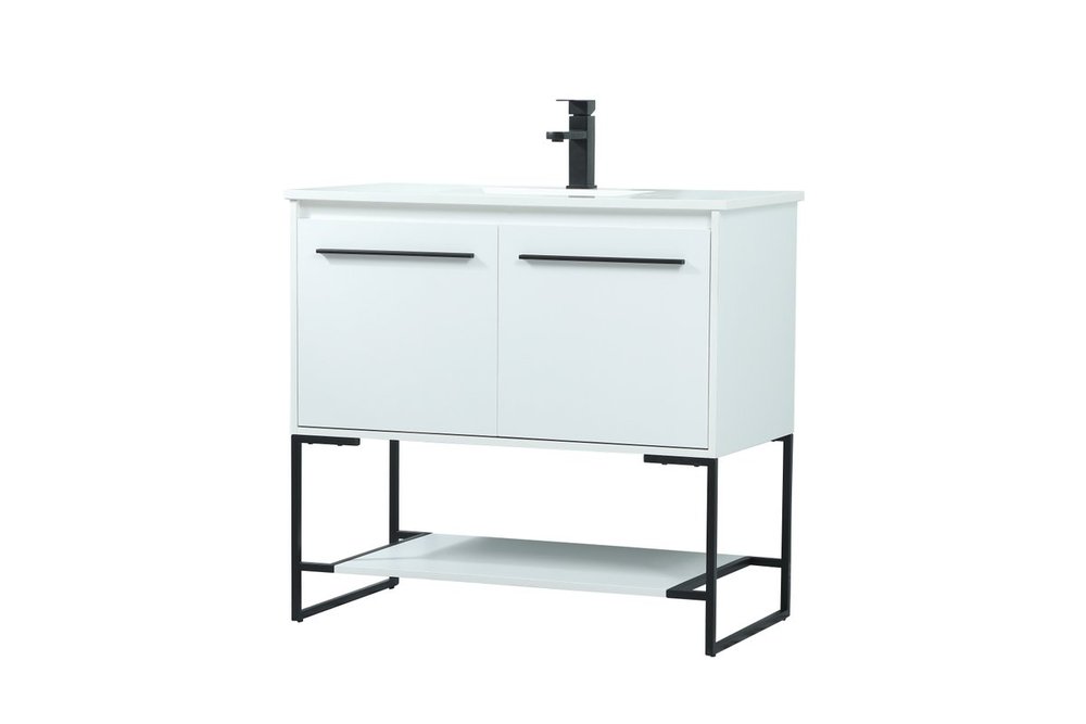 Live in modern comfort with this 36" white finish vanity. Dressed in a white and sleek black metal hardware, its contemporary style will have your bathroom or powder room elevated in industrial sophistication. The open shelf at the base and two doors reveal ample storage space for your bathroom essentials and miscellany. Clean lines create its own visual interest, adding trendy looks to your already chic room.