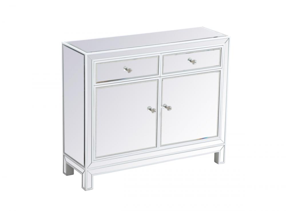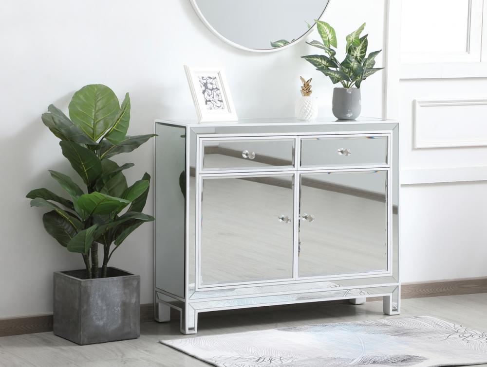 This mirrored cabinet in white is a great addition to your living room. It is detailed with distinctive mitered corners, crystal knobs, hand painted trim and frame, and is simply a charming accent piece.