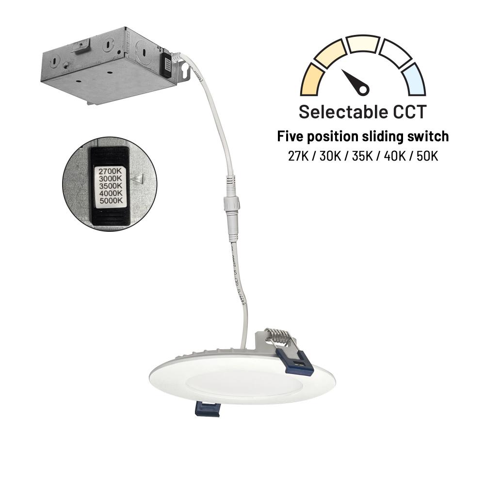 4" Flat wafer can-less LED downlights feature a non-metallic trim for corrosive environments. Can-less downlights are easy to install in new construction or remodel applications. Each luminaire includes a selectable CCT switch located on the junction box with a quick connect that allows for easy disconnect and mounting in the ceiling.