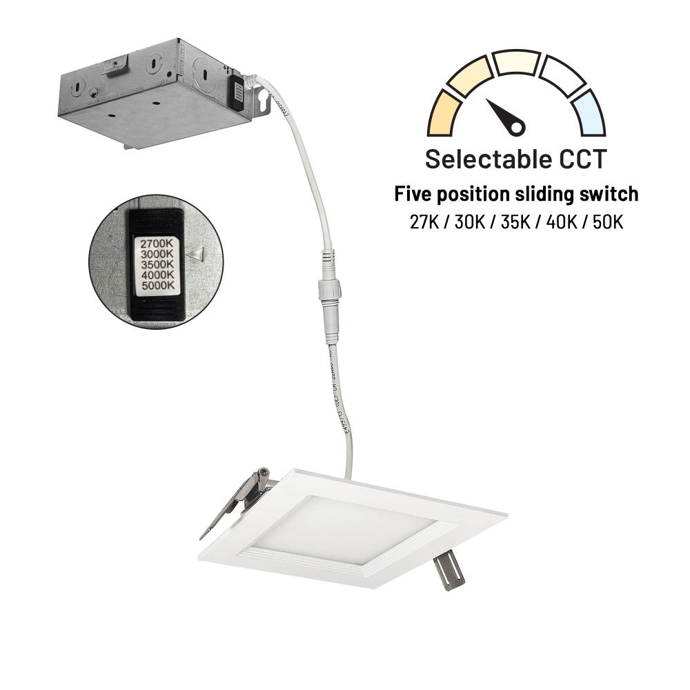 4" Square E-Series FLIN are a thin can-less recessed downlight for easy installation in new construction or remodel applications. Luminaires include a selectable color temperature switch located on the junction box of each luminaire with a quick connect that allows for easy disconnect and mounting in the ceiling.