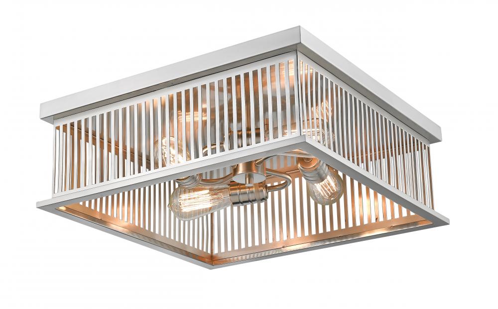 Bring an engaging look to a modern space with this industrial-themed four-light flush mount ceiling light. Its linear-style grid frame offers the beauty of brushed nickel finish steel and creates a peek-a-boo effect for its vintage-style bulbs.
