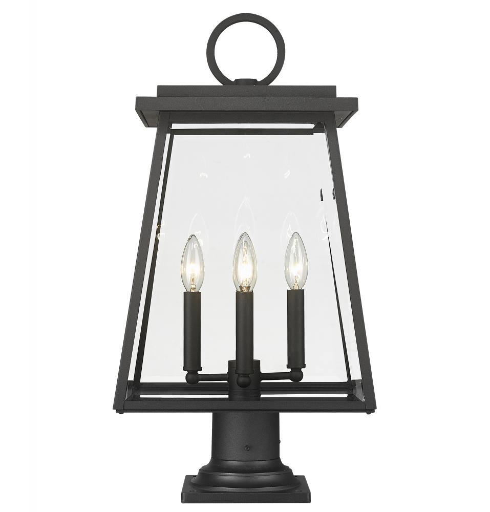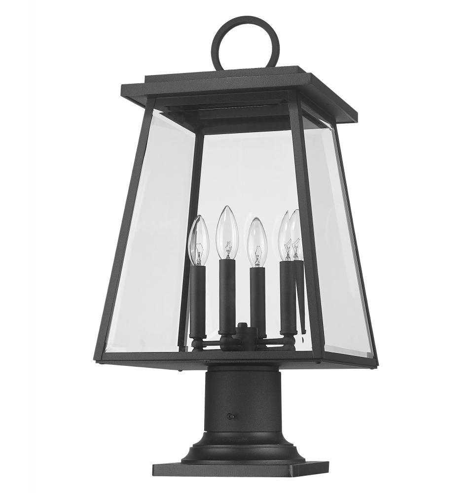 Turn exterior landscaped spaces or walkways into icons of old village nautical attitude. From the Broughton collection, this four-light outdoor pier-mounted fixture offers construction of sleek black aluminum and clear beveled glass panels on its lantern-style shade. Romantic candelabra bulb mounts and a flared pier base complete a list of chic features.