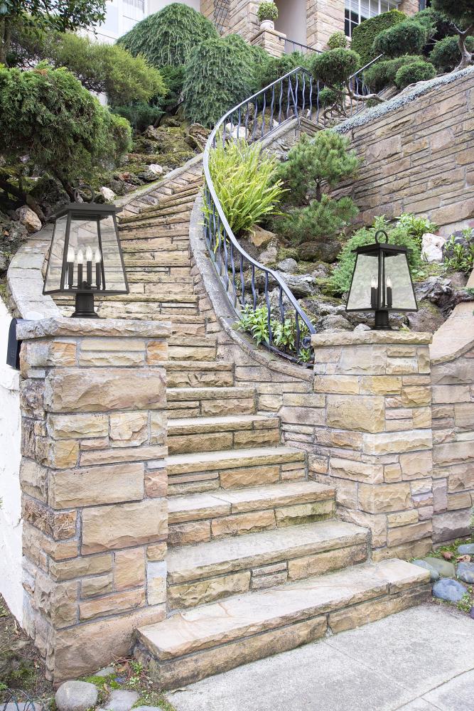 Defying convention, the Broughton series of outdoor lanterns is a well orchestrated craftsmen design with transitional elements. Beveled glass and a decorative loop on the lantern tops are crowning touches, along with stepped design on the top for added di