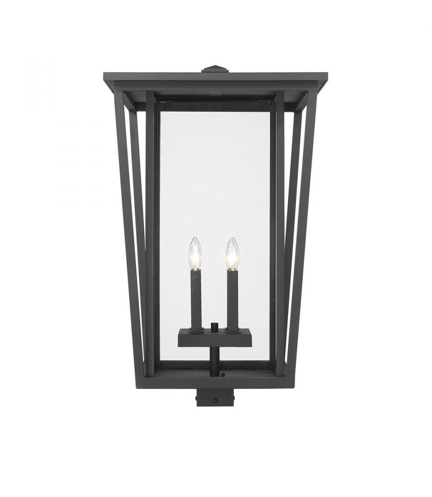 Angled sections merge to create an optically pleasing energy, adding a striking look to this four-light outdoor post-mount fixture. Top a post of your choice with this elegant hybrid traditional and modern fixture crafted of black finish aluminum with cool slanted features. Specially cut clear glass panels finish its tasteful design.
