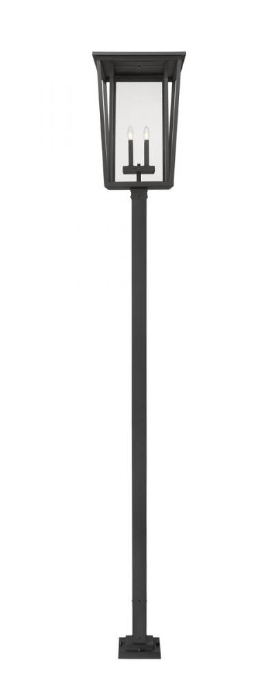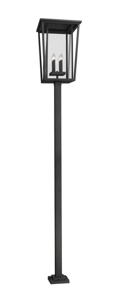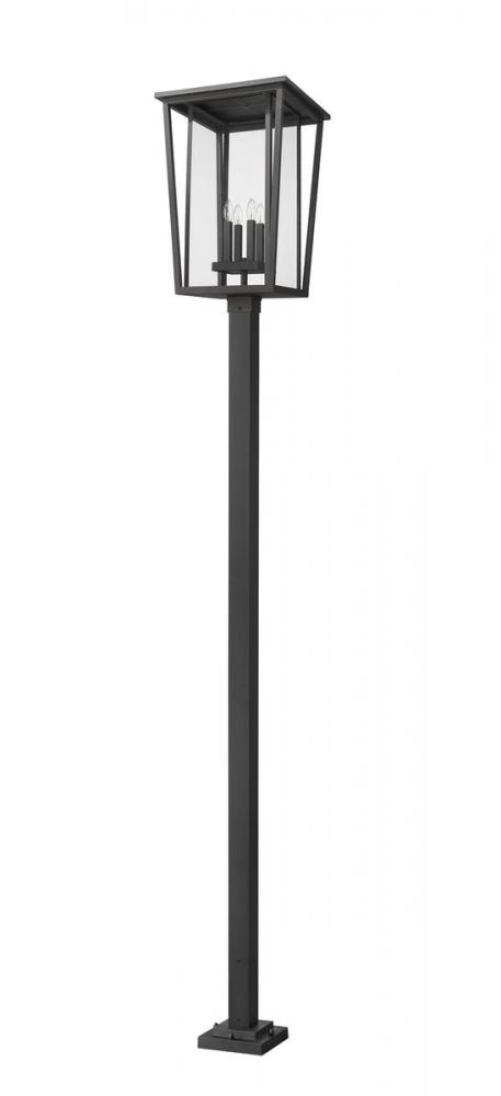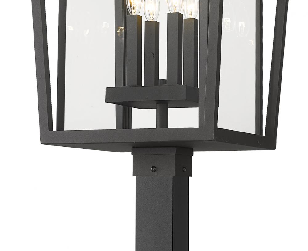A modern motif stylizes this four-light outdoor post-mounted fixture, creating an elegant updated look to a patio, walkway, or outdoor gate space. This fixture from the Seoul collection increases the glam factor in any outdoor space with its bold black finish aluminum frame and rounded post and specially cut clear glass panels that add an intriguing touch to a traditional-style housing.