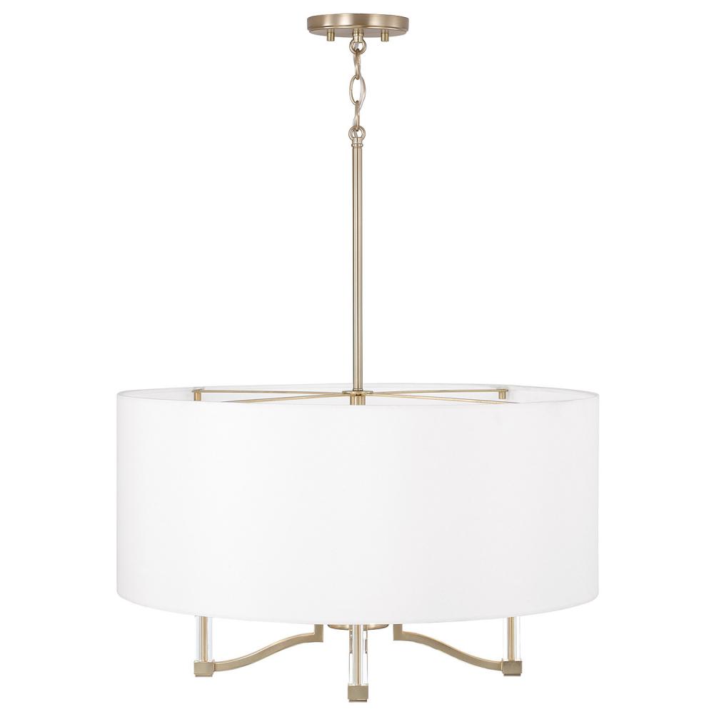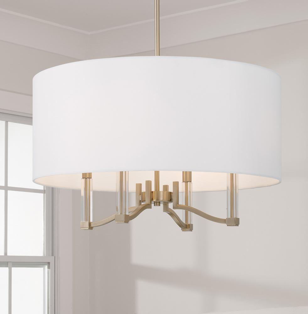 Blending transitional design with classic appeal, the Ingrid Pendant brings sophistication to any space. The Matte Brass arms curve slightly to meet the crisp acrylic candlesleeves, topped with the White fabric drum shade for a neat, tailored look.