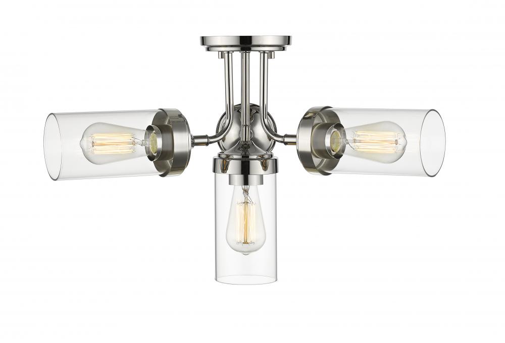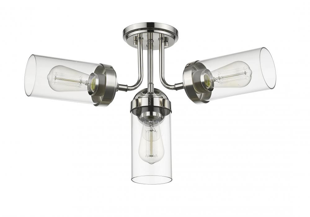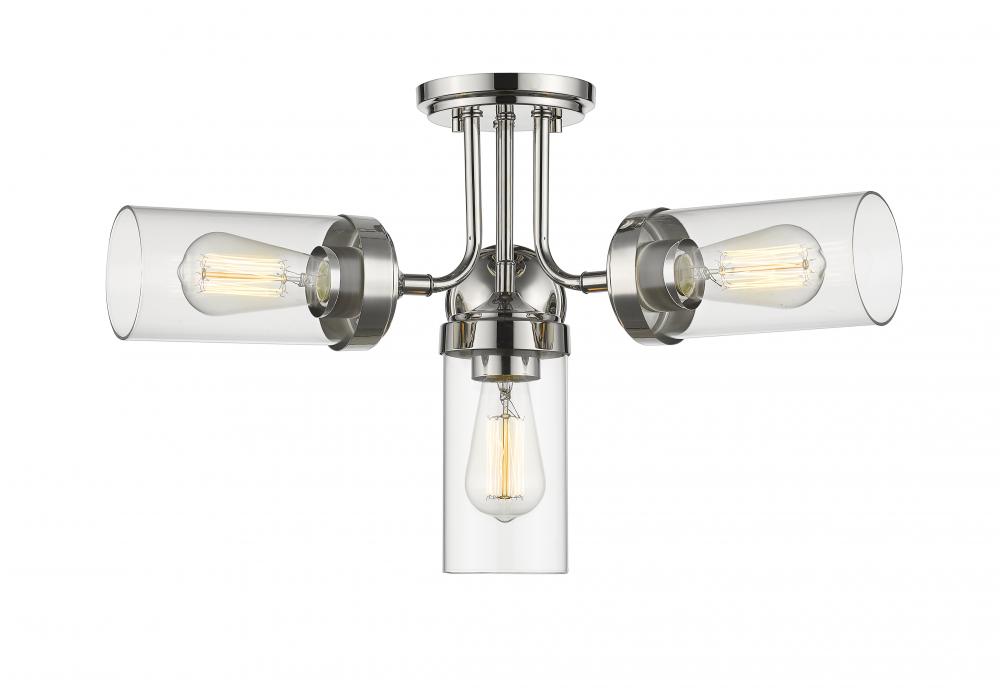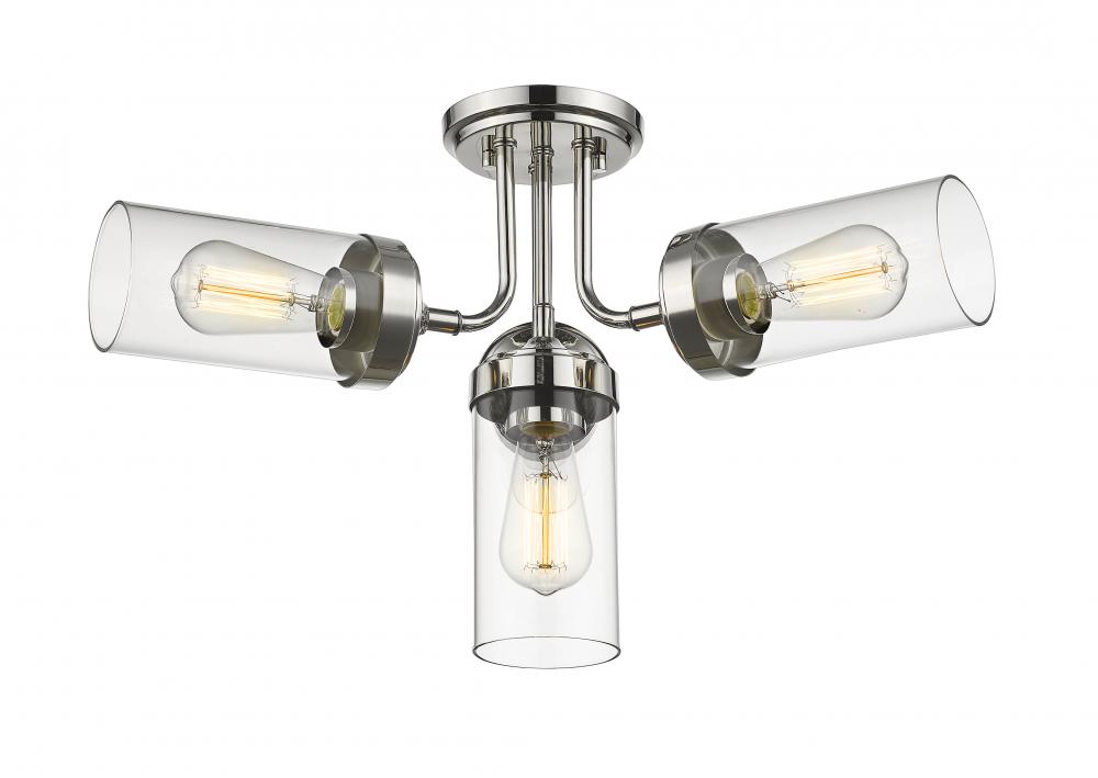 Bring the classic beauty of polished nickel finish steel and clear glass to a contemporary space with urban industrial attitude. This four-light semi flushmount ceiling light completes the custom design scheme of a living room, entryway, or dining area.