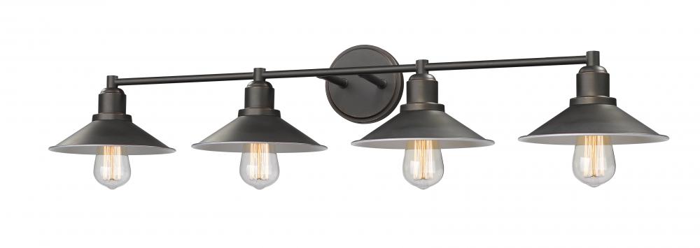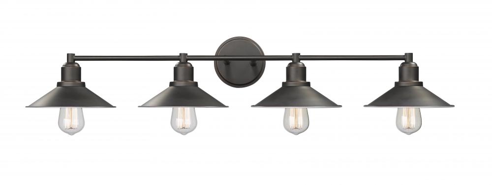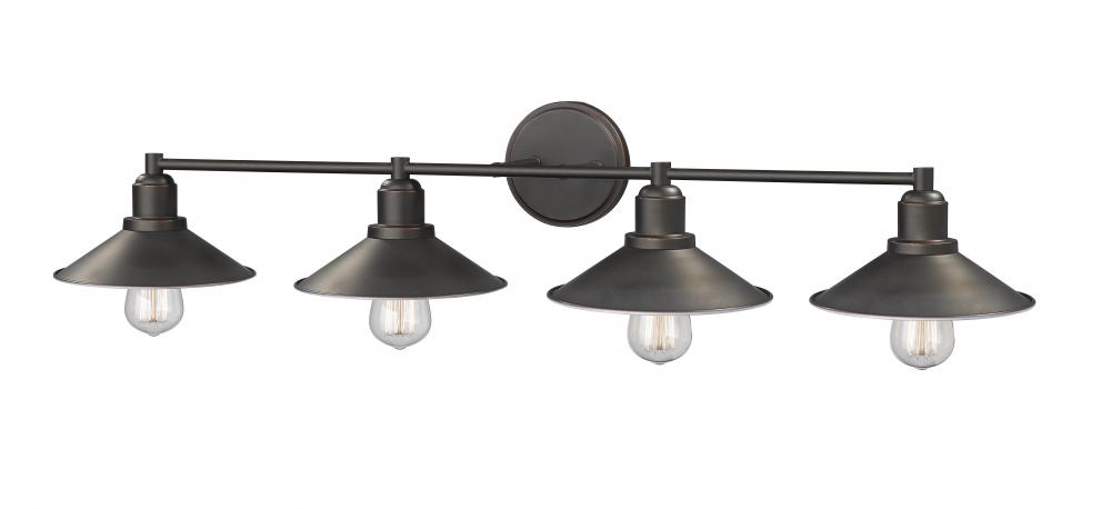 This four-light vanity fixture delivers a dynamic look that frames a master en suite sink in style. Embrace the rich olde bronze finish steel frame and hood shades that build a suitable setting for charming vintage bulbs.