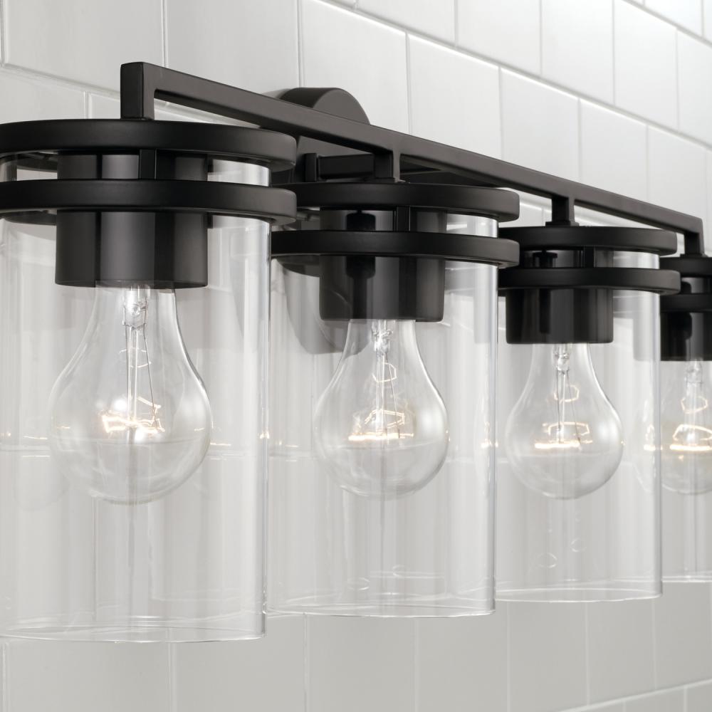 DETAILS: Clear glass cynlinders in 2-Light, 3-Light, or 4-Light available in three finishes of Aged Brass, Brushed Nickel, or Matte Black for style versatility.