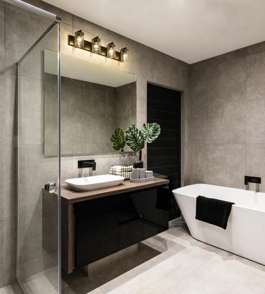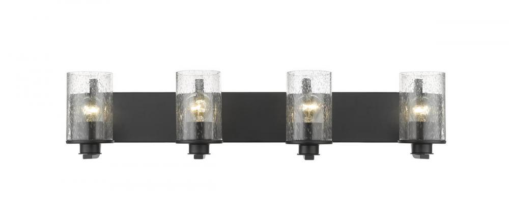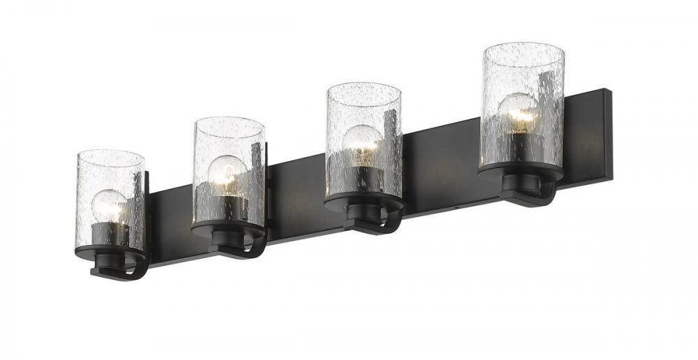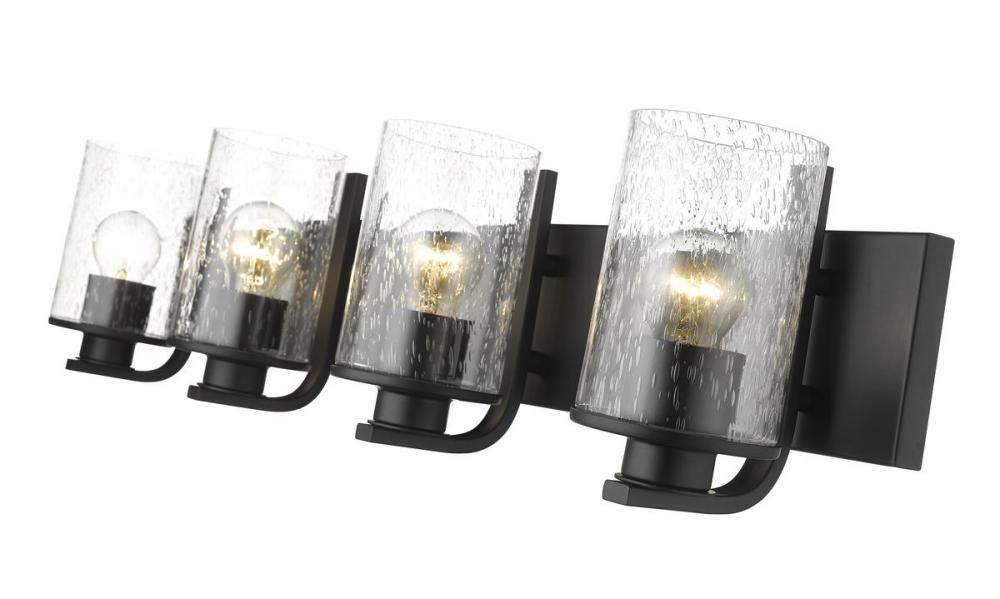 This four-light vanity light from the Beckett collection offers a minimalist look with customized materials. Create a sophisticated aesthetic in a mid-sized bath or dressing space with a fixture formed of bold matte black finish steel and highlighted with the romantic look of cylindrical clear seedy glass shades.
