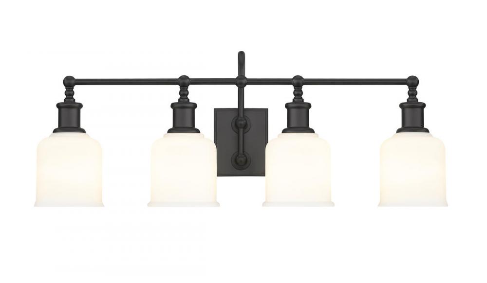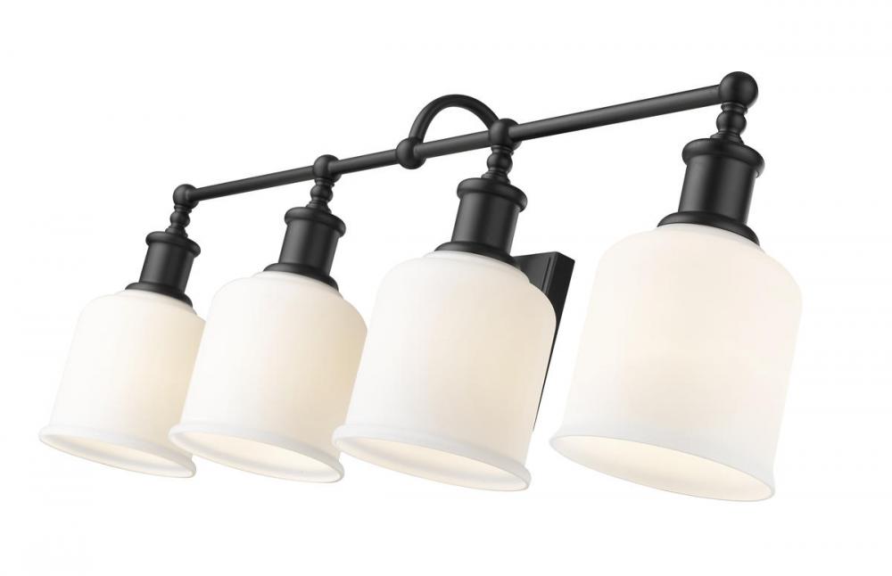 Village-inspired charm borrows from a nautical theme to create an inspiring look for traditional and transitional bath spaces in this four-light vanity from the Bryant collection. With a bold matte black finish steel frame and wall mount, its chic opal glass shades form a fabulous palette contrast. A curved arm, ornate holders, and lipped shades generate extra charm that stylize a custom bath space.