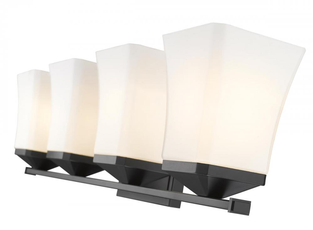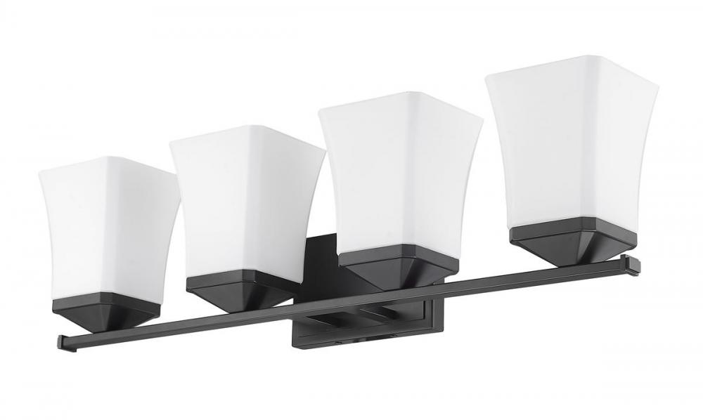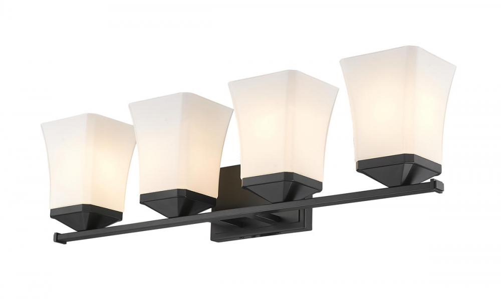 Perfect for the bath, this four-light vanity fixture boasts a flared silhouette. Providing ample lighting, the matte black finish and steel construction ensure a stylish touch.