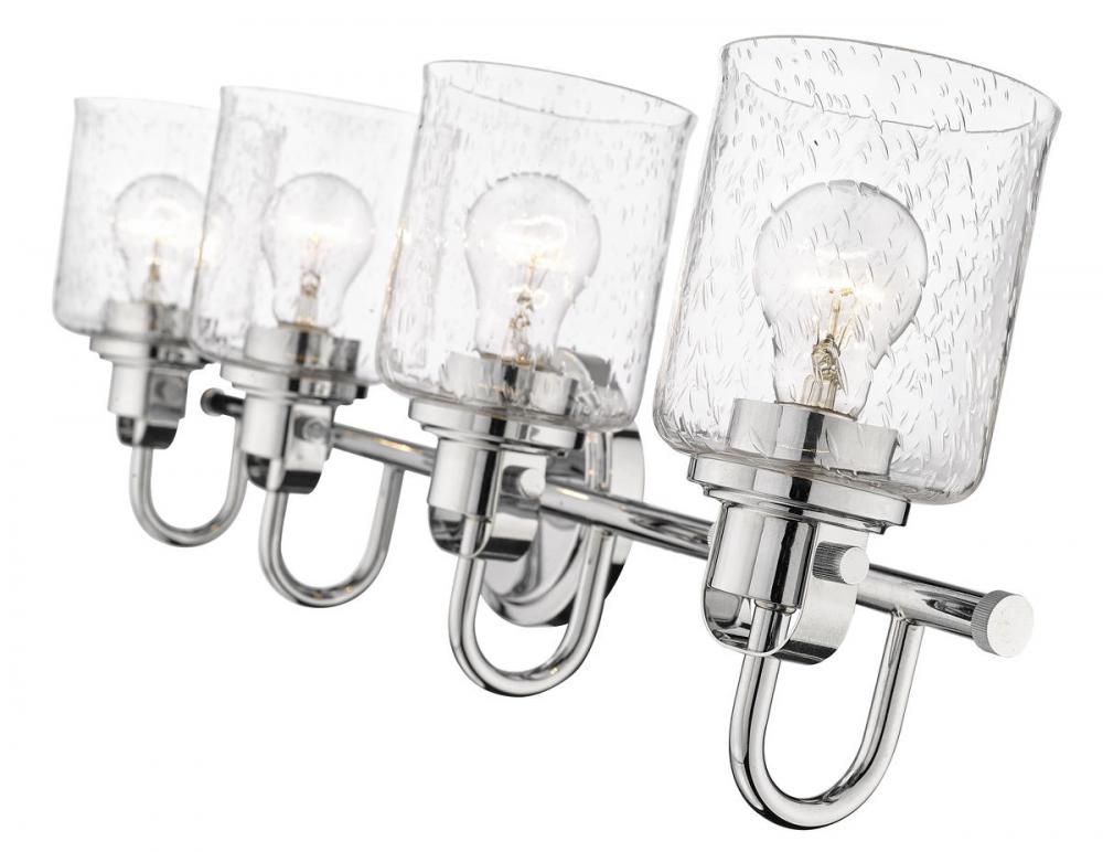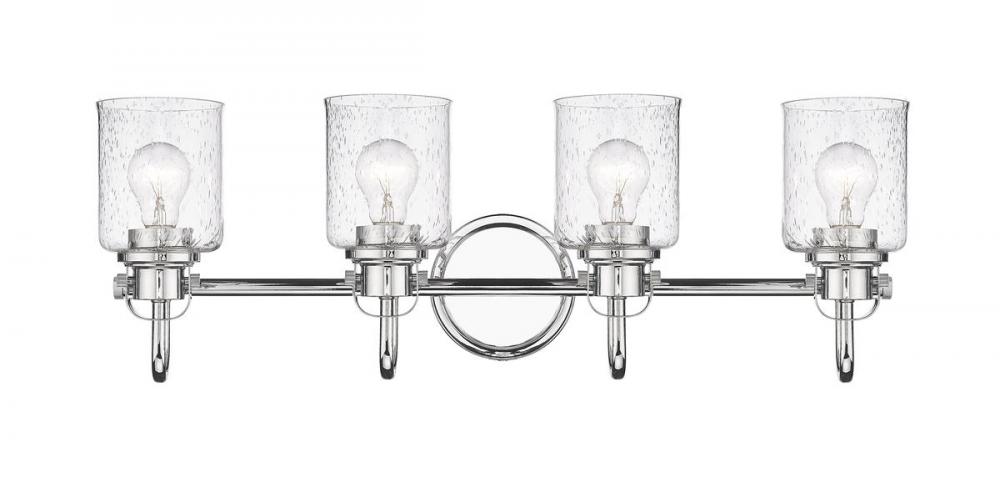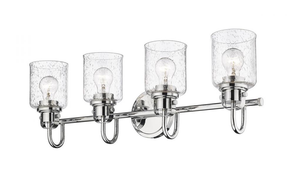 This four-light vanity fixture in brushed nickel provides a playful way to include metropolitan style to your hallway, bathroom, or bedroom. The cylindrical shade with a seeded glass top is made of steel, offering an ambient glow.