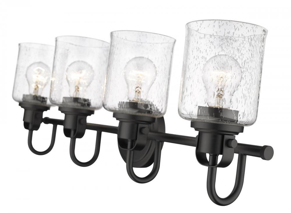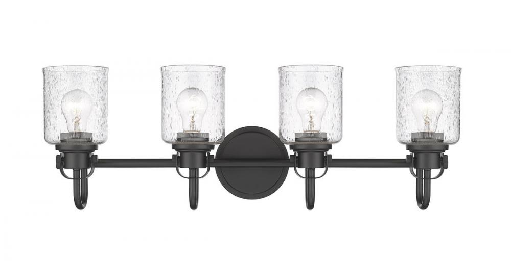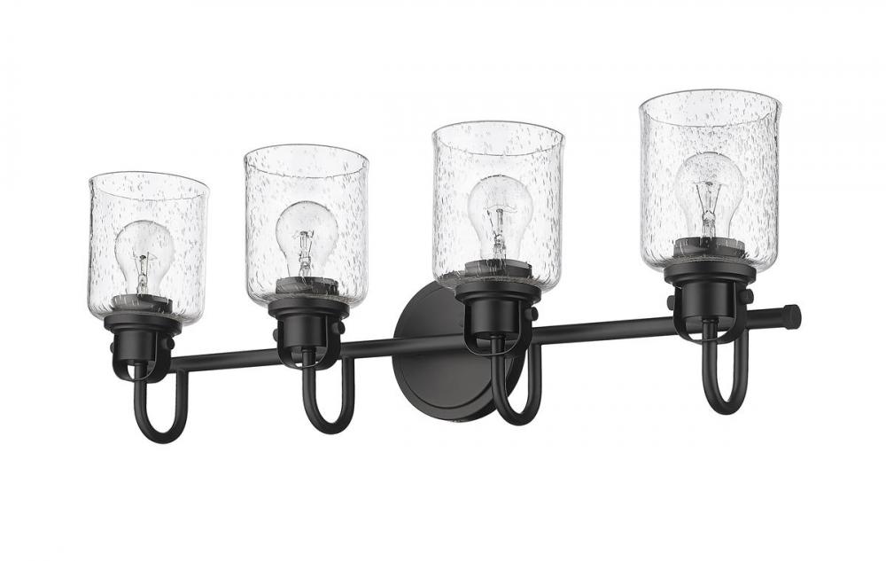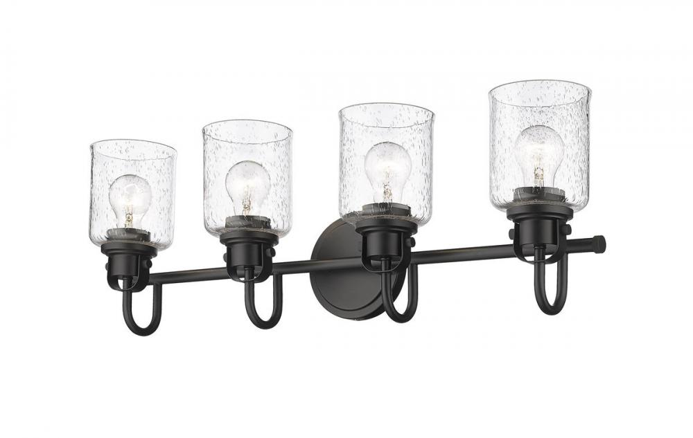 This four-light vanity fixture in heirloom gold provides a playful way to include metropolitan style to your hallway, bathroom, or bedroom. The cylindrical shade with a seeded glass top is made of steel, offering an ambient glow.