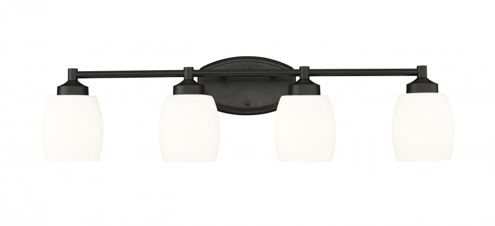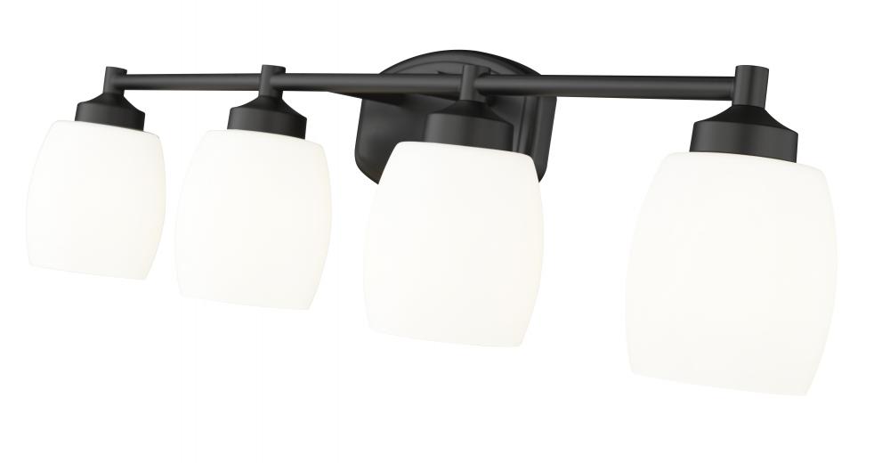 Create contrast with the deep matte black finish featured on this modern four-light vanity fixture. Perfect for a large bath, it offers bright illumination filtered through matte opal shades, each with a graceful curved silhouette. Its diffused lighting sets the perfect ambiance for relaxation and tasks, both morning and evening.