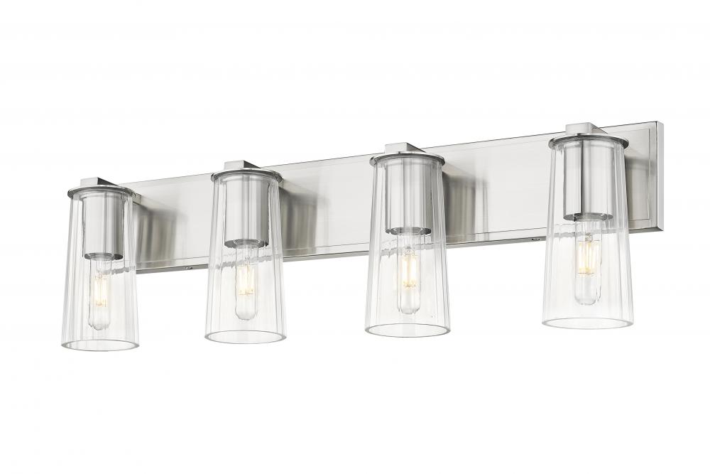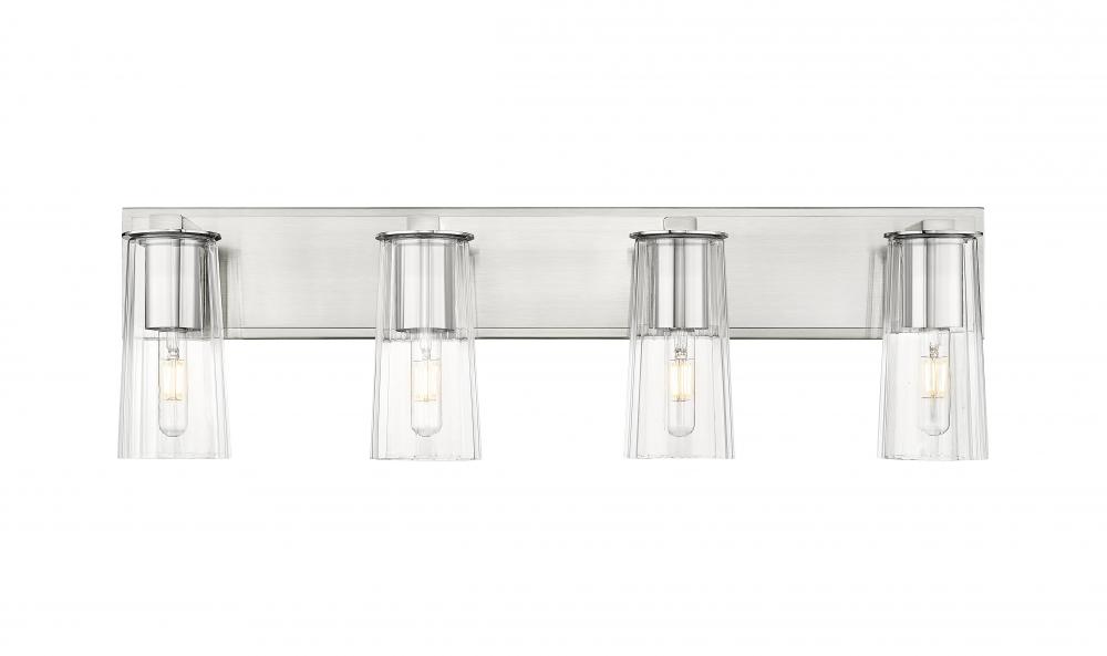 Four lights make this industrial vanity fixture the perfect solution in larger bathroom spaces, offering bright task lighting for all your beauty and grooming rituals. Charming style is expressed in a brushed nickel finish wall plate and hardware, with tapering clear glass shades that house tubular bulbs for a dose of vintage character. Install with lights up or down to create the perfect look.