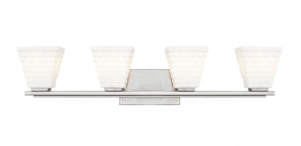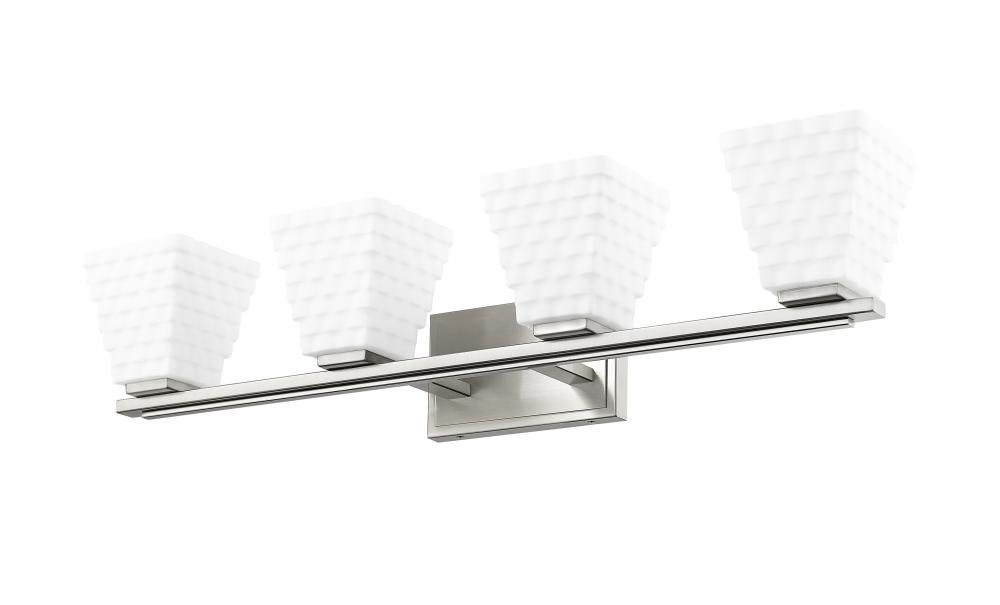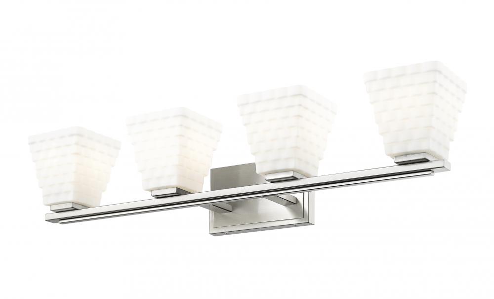 Reimagine your bathroom lighting with the artistic geometrics of this modern four-light vanity bath light. Perfect for bright, diffused illumination, it features a simple, clean-lined structure complete with a brushed nickel finish backplate and arm, each with layered details. Shades are boldly eye-catching, each crafted in opal glass and featuring layered rectangles that built a dimensional, artistic presentation suited to a refined space.