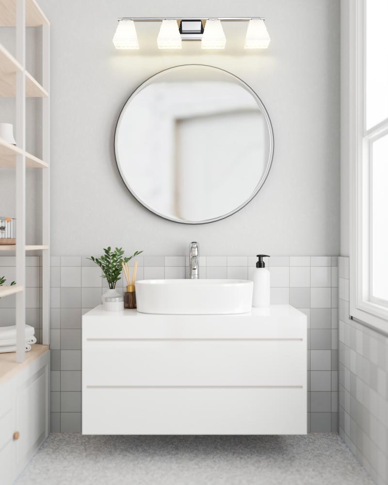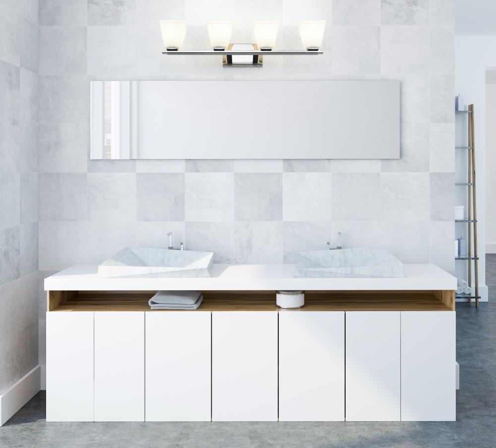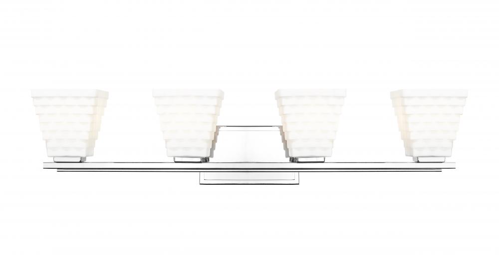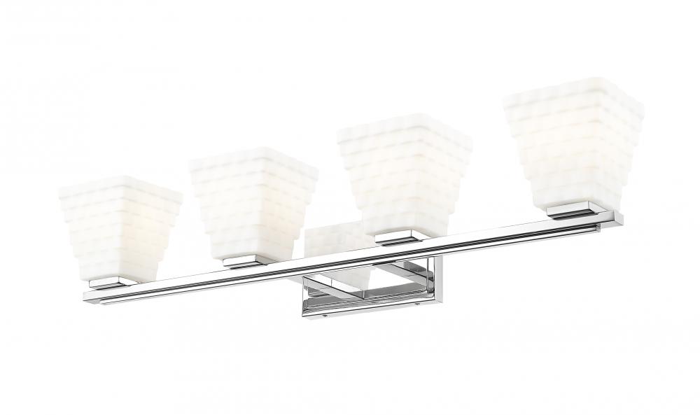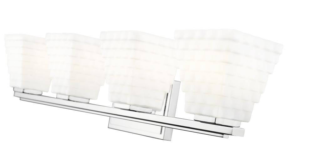 The bright ambiance of a chrome finish creates fresh, contemporary appeal for this modern four-light vanity bath light. Its simple structure includes a layered backplate and arm, each adding texture to the overall aesthetics of the fixture. Four shades feature layered opal glass rectangles that create a tapered square silhouette, offering bright, diffused illumination perfect for daily rituals.