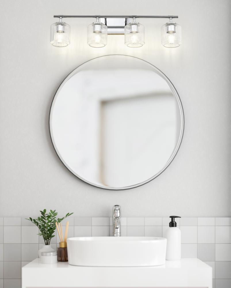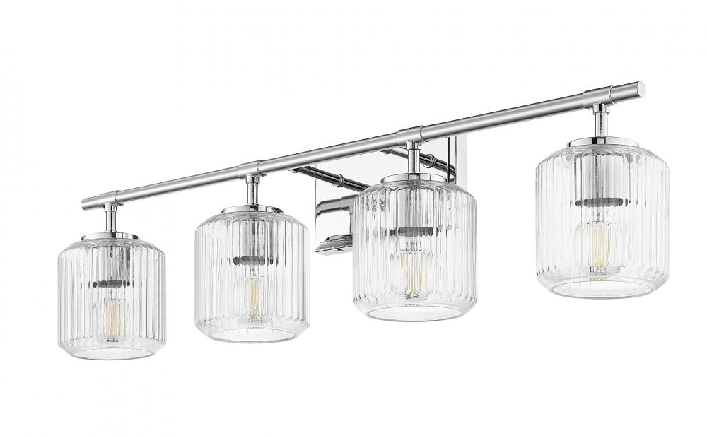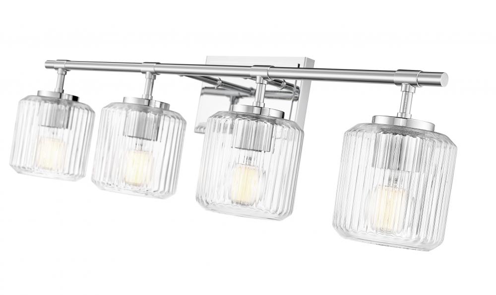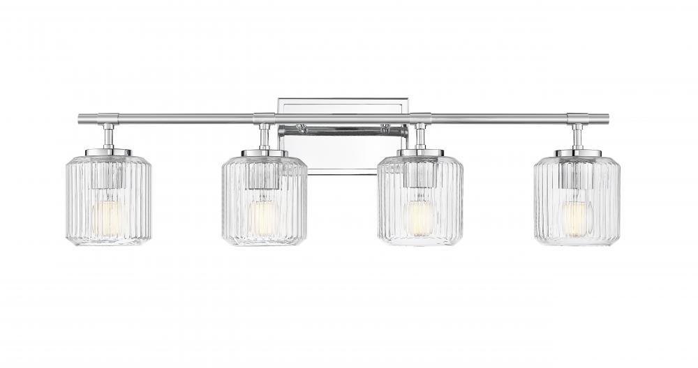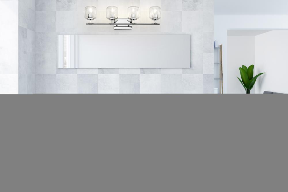 Gleaming chrome finishing lends a mirror effect to the clean lines and precise design of this modern four-light vanity bath light. Its straight arm and suspension rods host four sparkling clear glass shades, ribbed to create a soft, undulating effect thats sure to captivate as you indulge in morning and evening rituals.