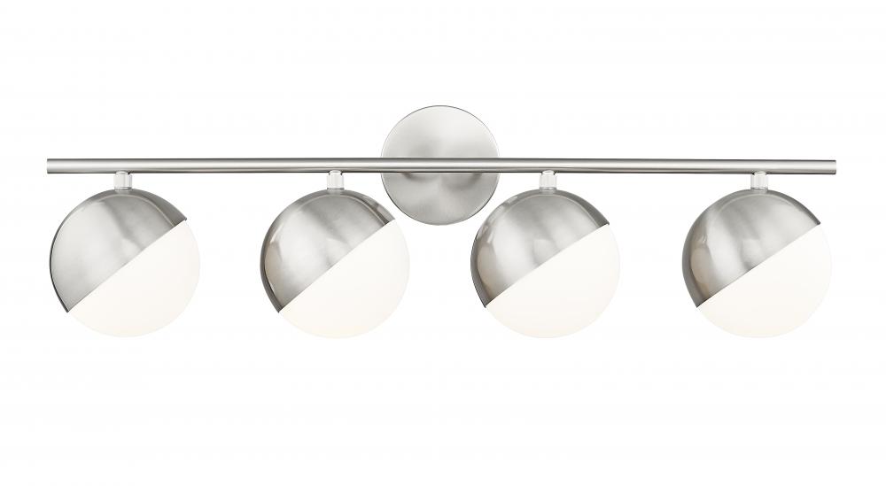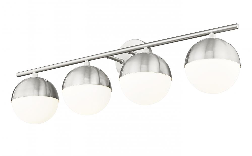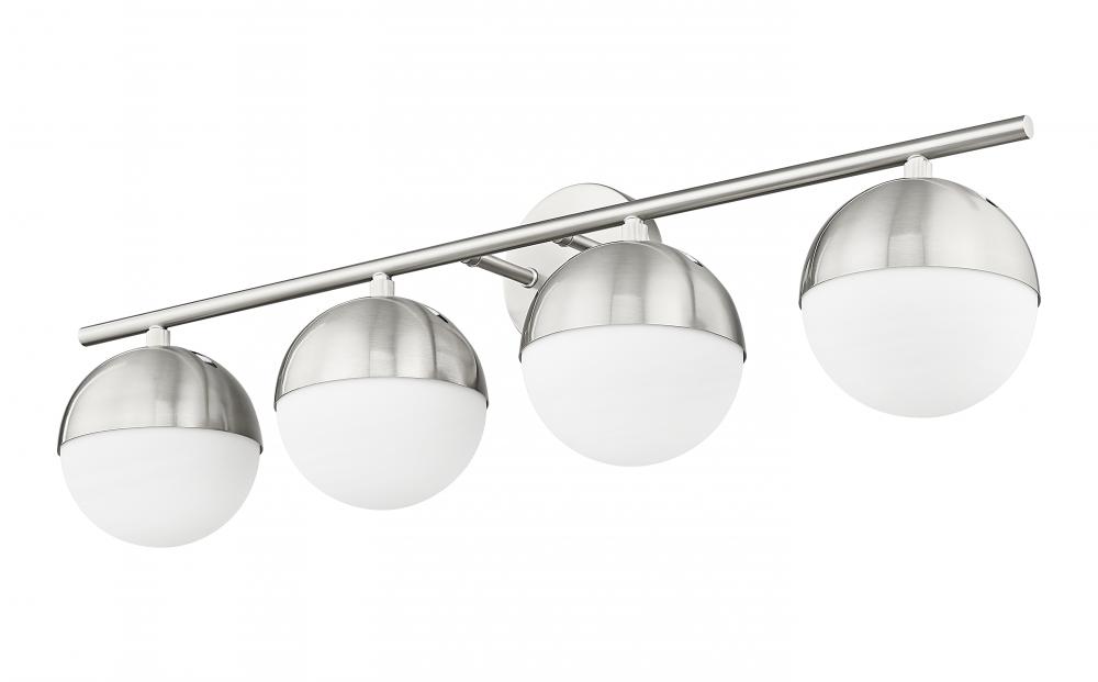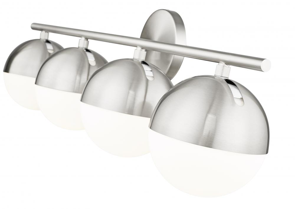 Embrace sophisticated design with the cool, sleek elegance of this mid-century four-light vanity bath light. In cool brushed nickel finishing, it showcases a straightforward look complete with orb shades of matte opal glass for soft, inviting illumination. Moveable shields allow for a custom configuration and directional illumination to best suit your space and style.