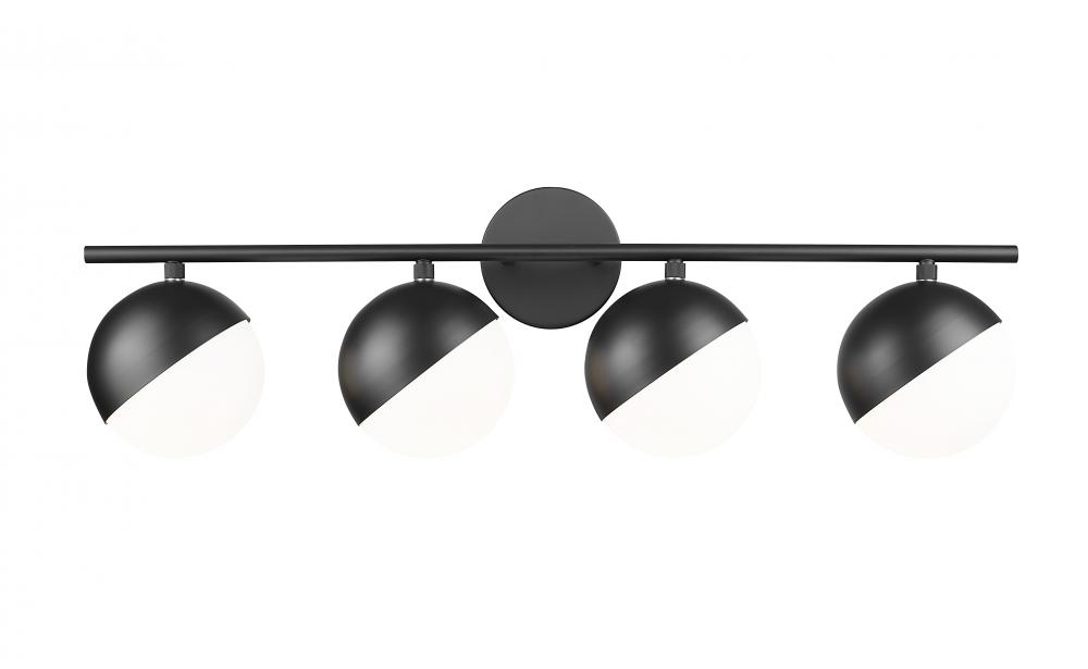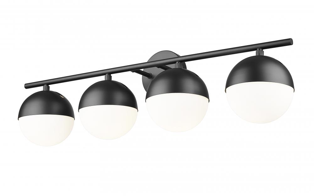 Reimagine your bathroom space with the vintage inspirations and fresh style of this mid-century four-light vanity bath light. In matte black, it maximizes contrast and depth, pairing perfectly with contemporary, urban and restoration design themes. Its moveable metal shades allow for customization, while orbs of matte opal glass create soft, inviting illumination for all your grooming and beauty tasks.