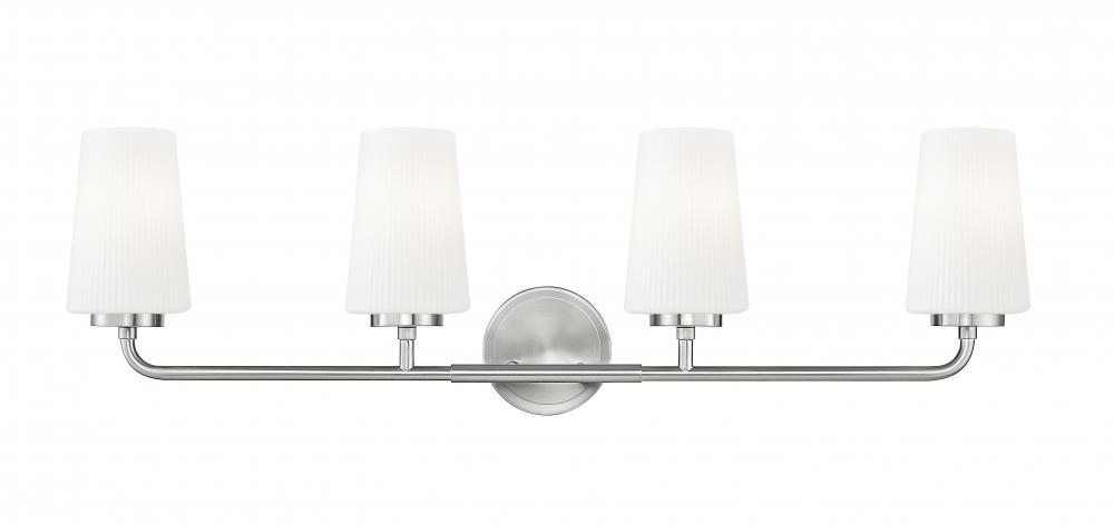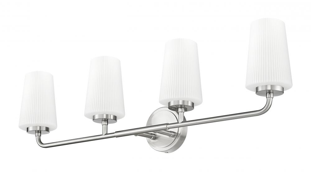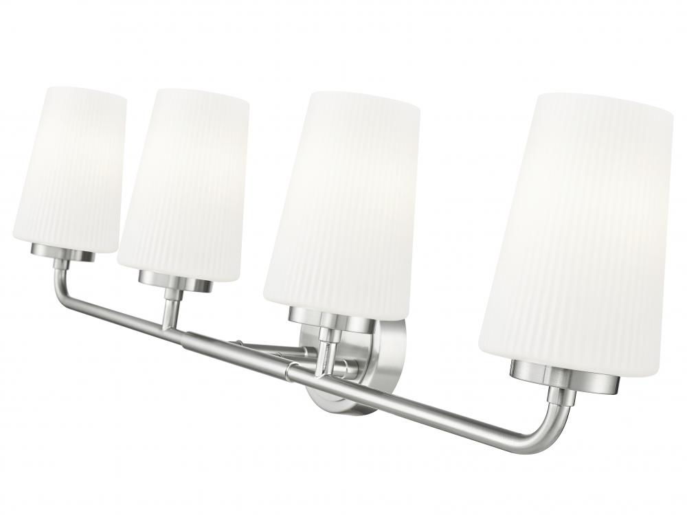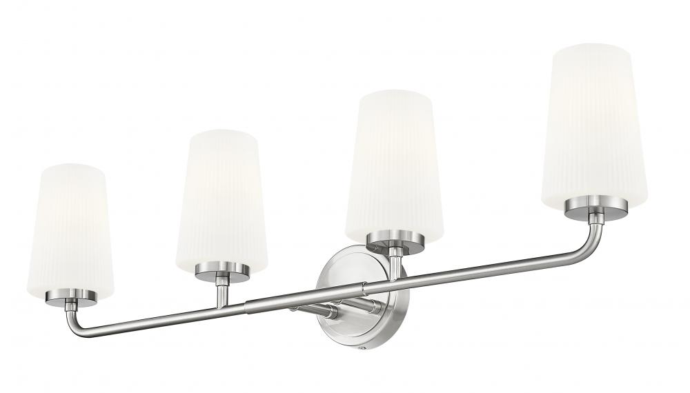 Set a refined tone in your primary or guest en suite with this modern four-light vanity wall light. Tall, tapering shades crafted in ribbed opal glass glow with light, offering excellent ambiance for all your morning and evening rituals. Its brushed nickel finish gleams in the light and adds subtle, timeless style.