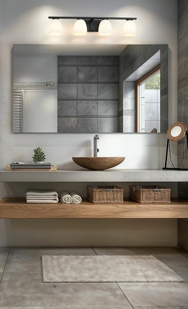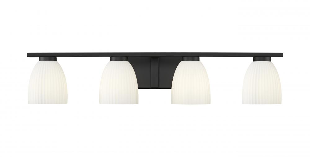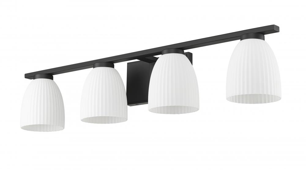 Bold and streamlined in a matte black finish, this four-light vanity fixture commands attention with quiet confidence. Matte opal glass softens the look, while ribbed details create a glow that?s gentle and architectural. It?s a modern essential that adds depth without distraction.