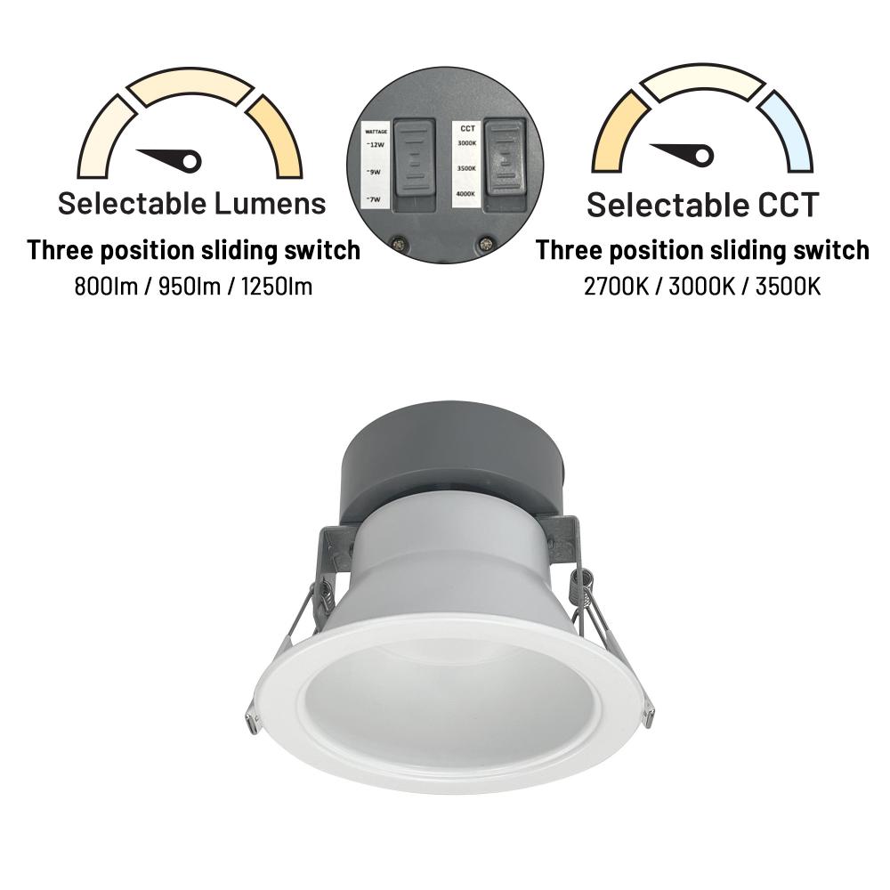 Lumens / Wattage: Selectable Lumens (800lm / 7W; 950lm / 9W; 1250lm / 12W)
