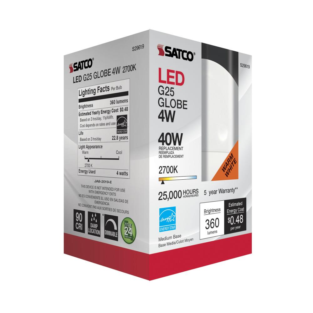 Satco's S29619 4-watt, LED globe shaped bulb offers warm white light and a 170 degree beam spread. This elegant bulb is perfect for accent and pendant lighting. Dimmable and long lasting, this frost finished bulb delivers 25,000 hours of exceptional il