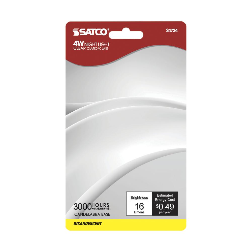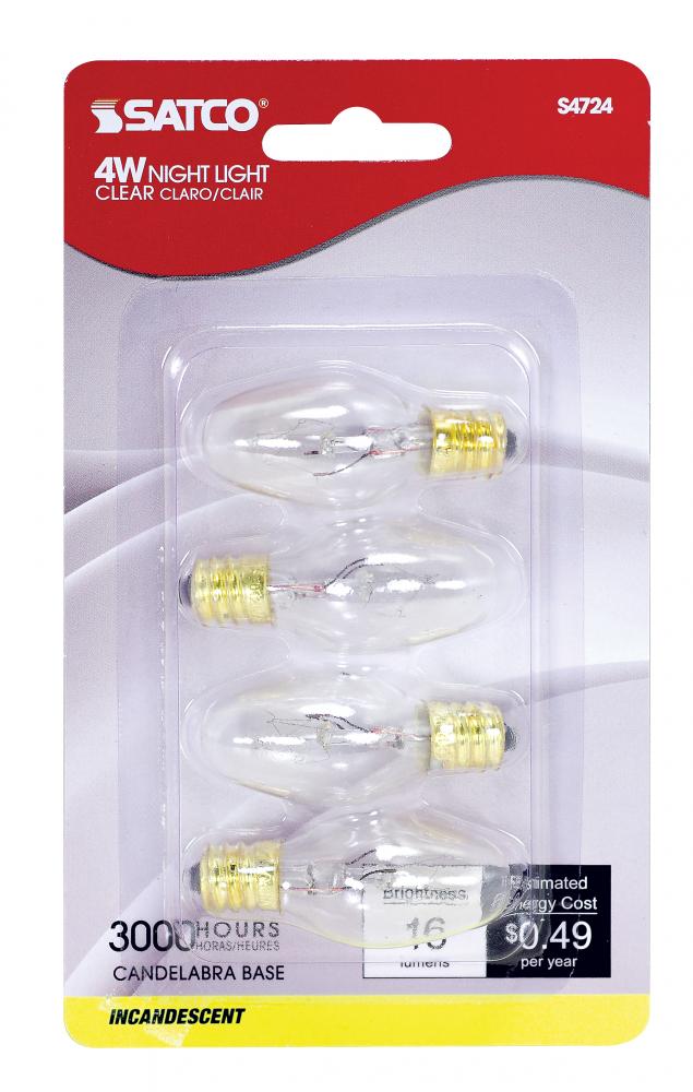 4 Watt C7 Incandescent; Clear; 3000 Average rated hours; 16 Lumens; Candelabra base; 120 Volt; 4-Card