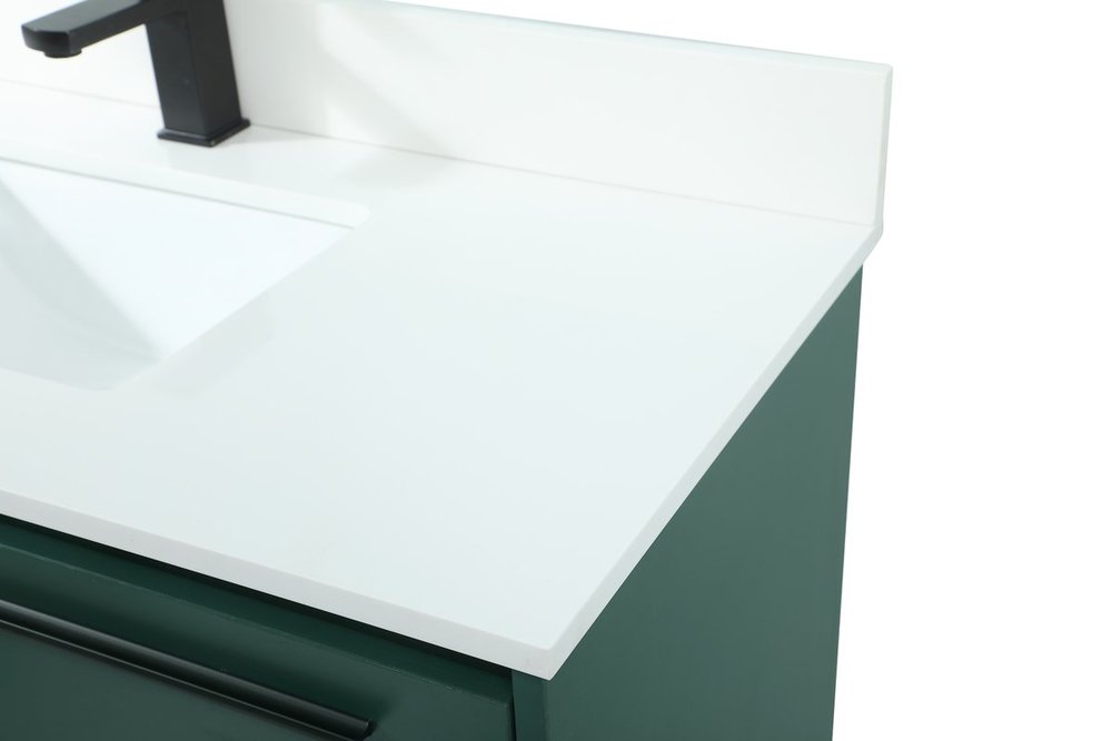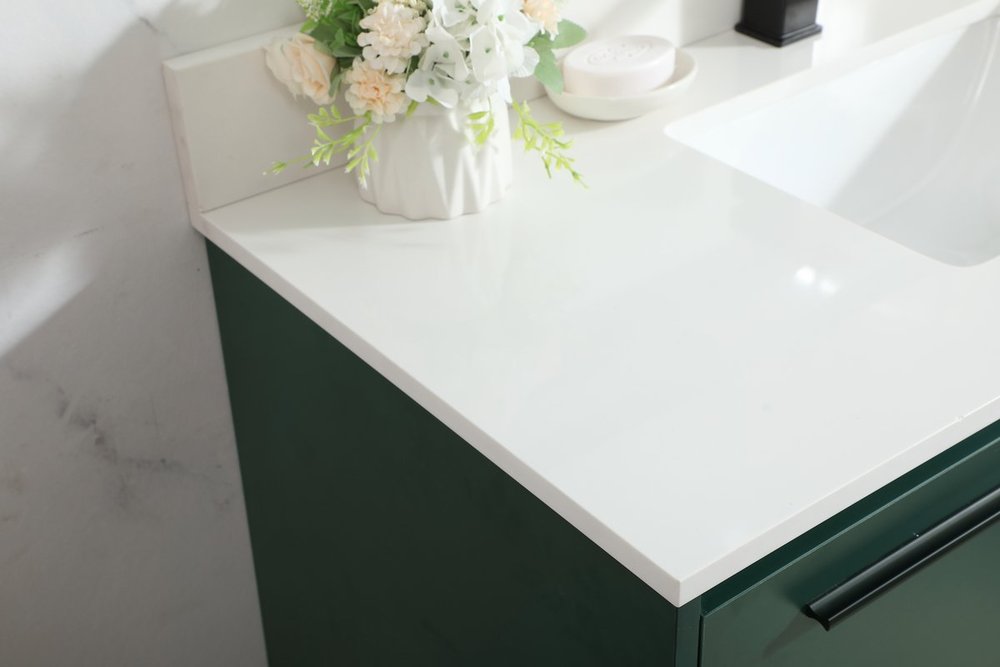 Comes with an undermount porcelain sink and a durable ivory white engineered marble stone top