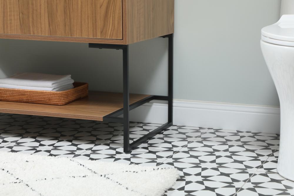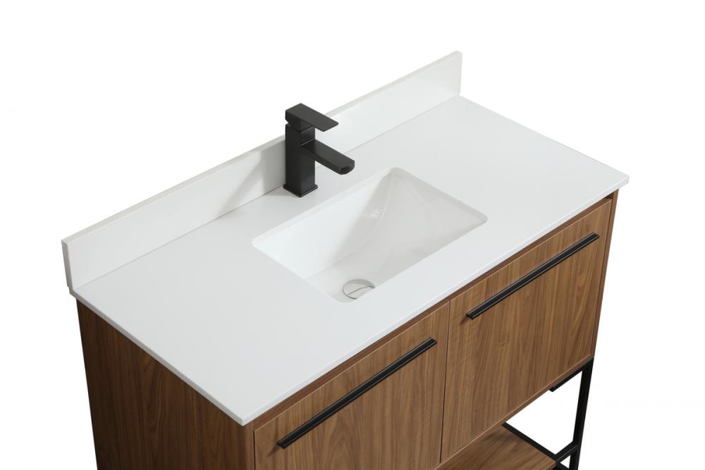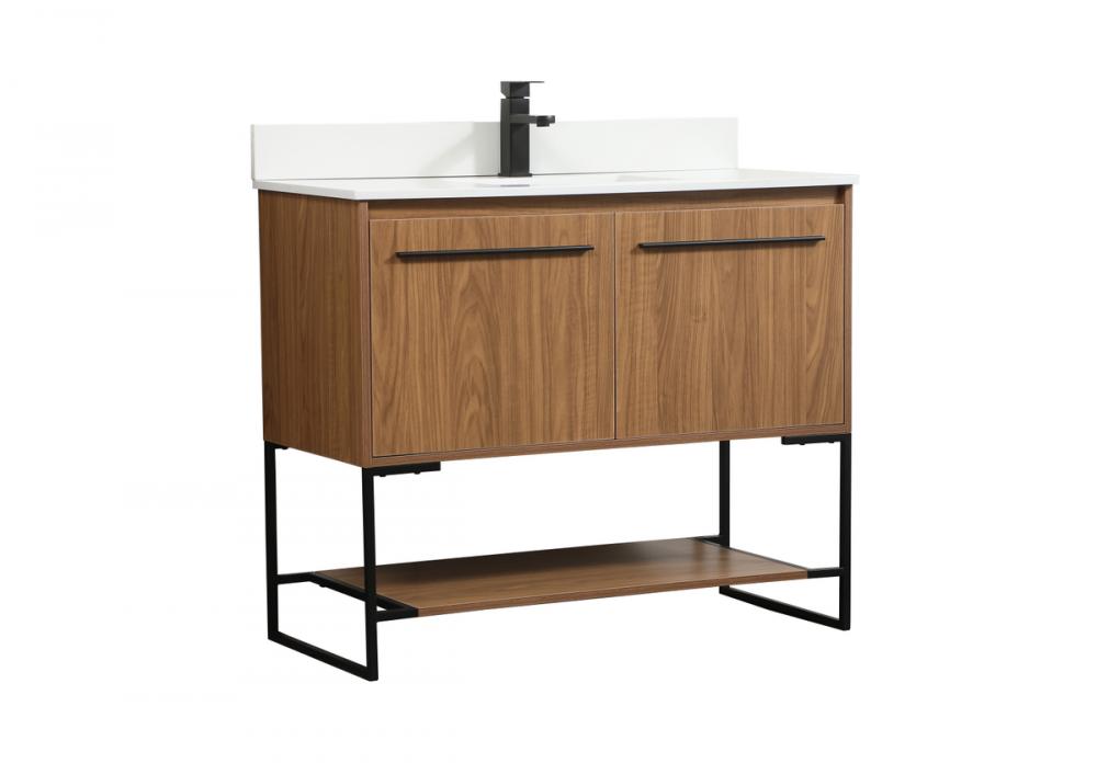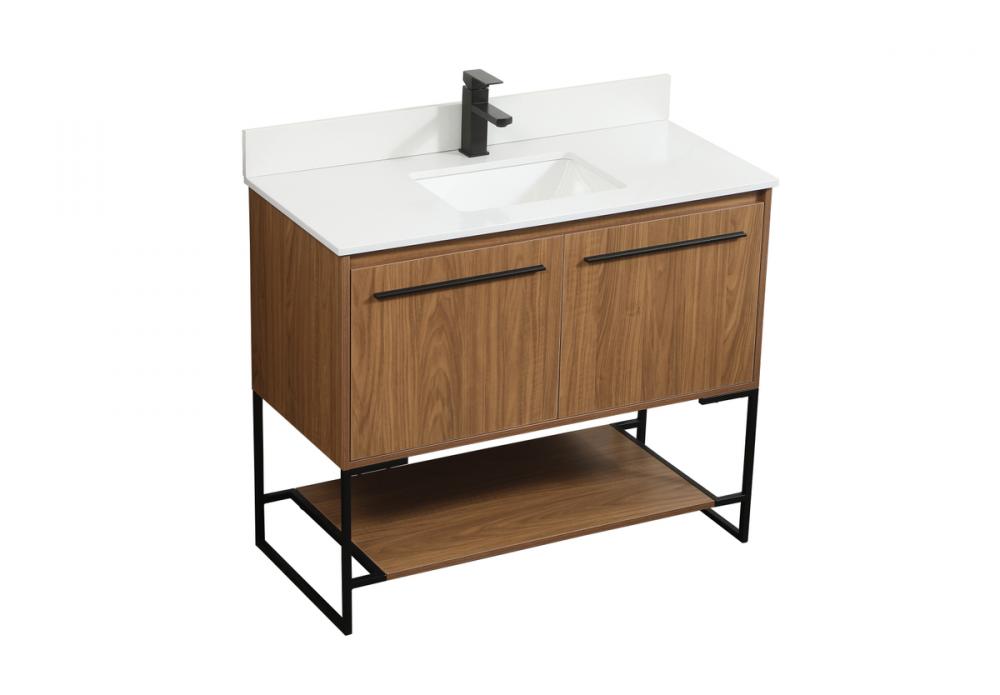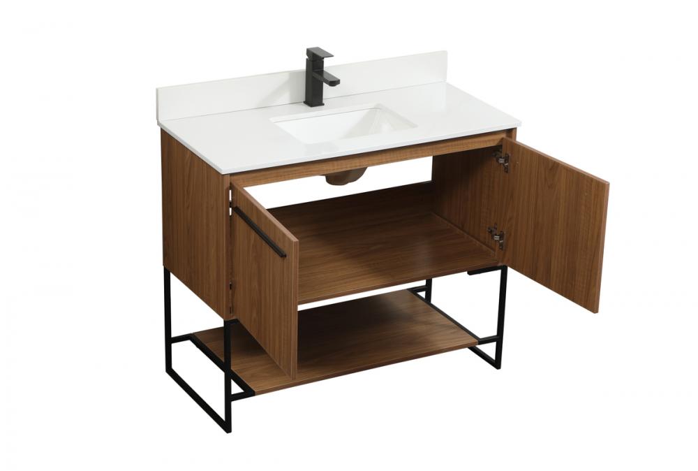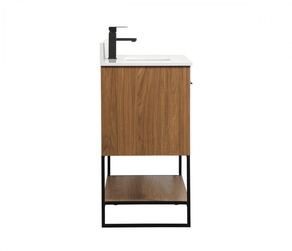 Live in comfort with this modern vanity. Dressed in a walnut brown and modern black metal hardware, its sleek style will have your bathroom or powder room elevated in industrial sophistication. The open shelf at the base and two doors reveal ample storage space for your bathroom essentials. Clean lines create its own visual interest, adding trendy looks to your already chic room. Comes with a matching backsplash to complete the look and protects your wall.
