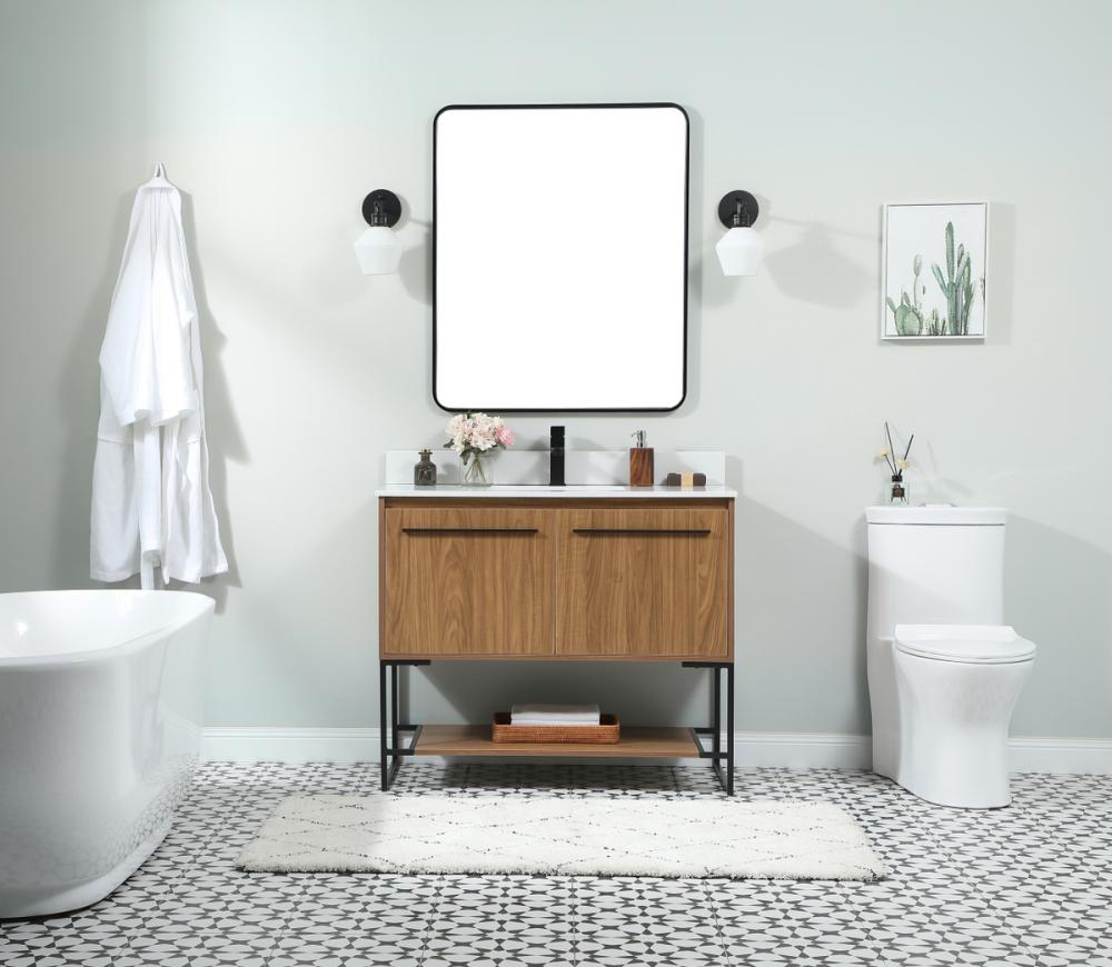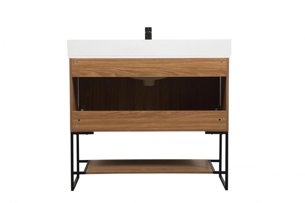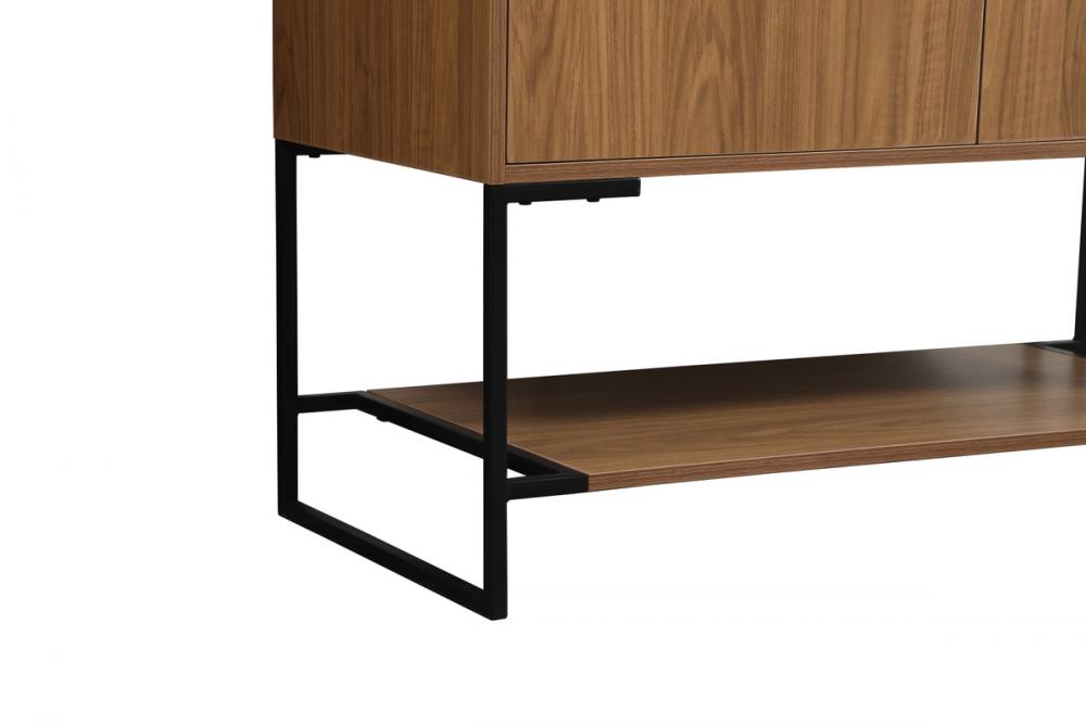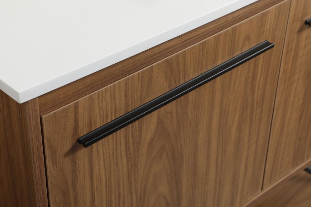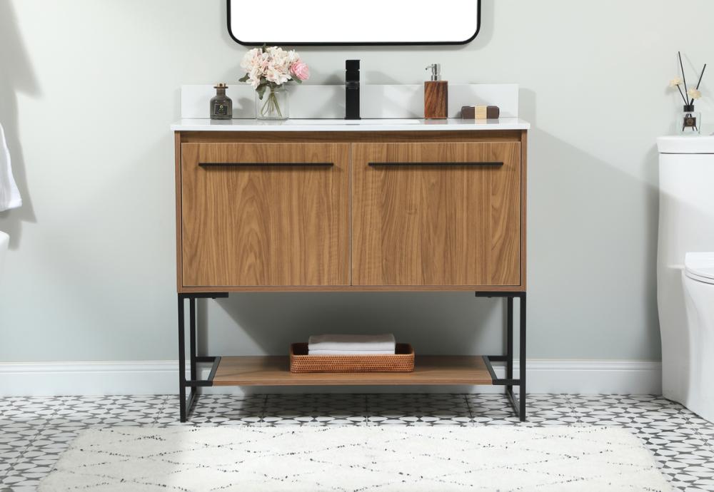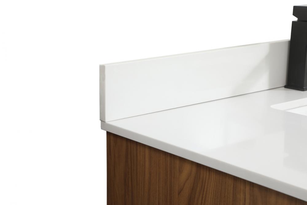 Live in comfort with this modern vanity. Dressed in a walnut brown and modern black metal hardware, its sleek style will have your bathroom or powder room elevated in industrial sophistication. The open shelf at the base and two doors reveal ample storage space for your bathroom essentials. Clean lines create its own visual interest, adding trendy looks to your already chic room. Comes with a matching backsplash to complete the look and protects your wall.