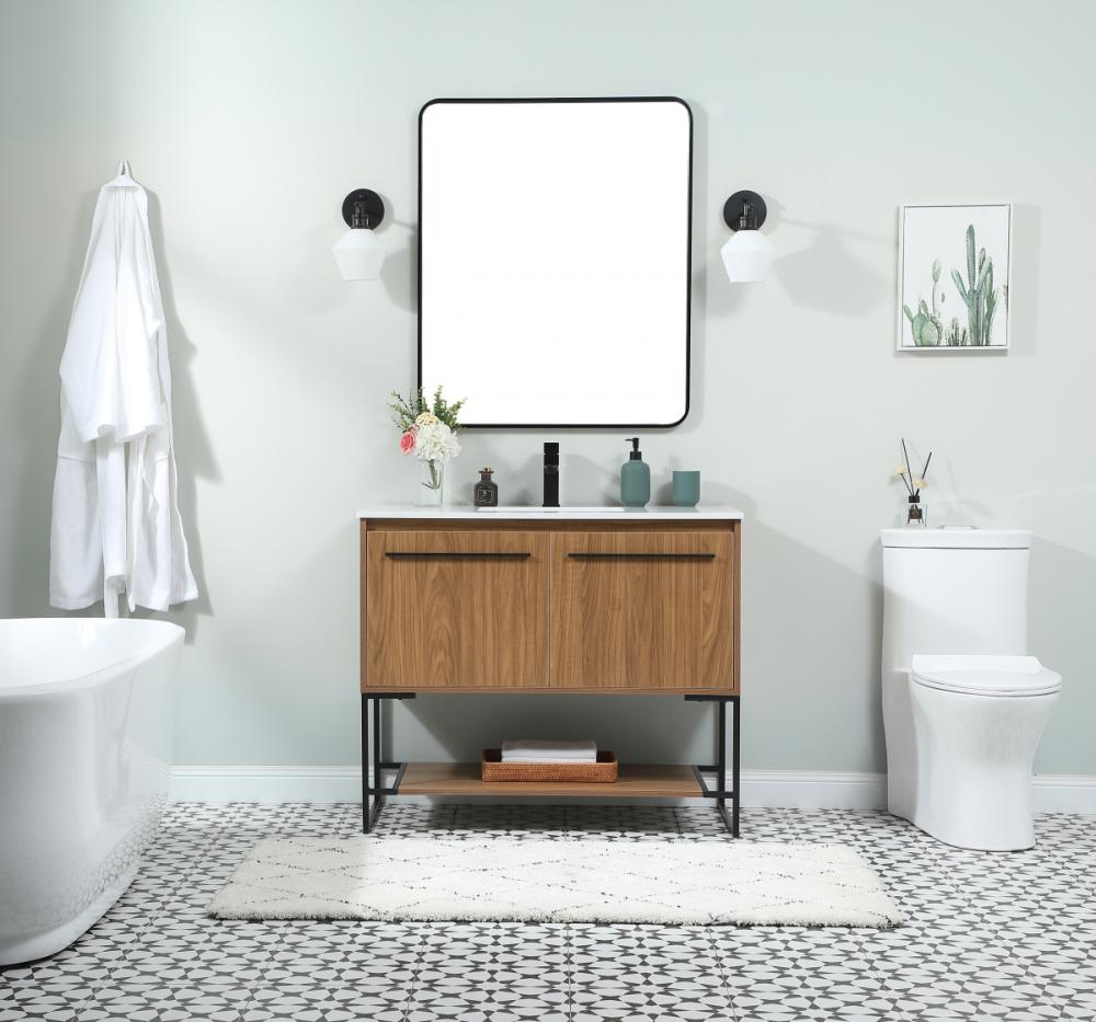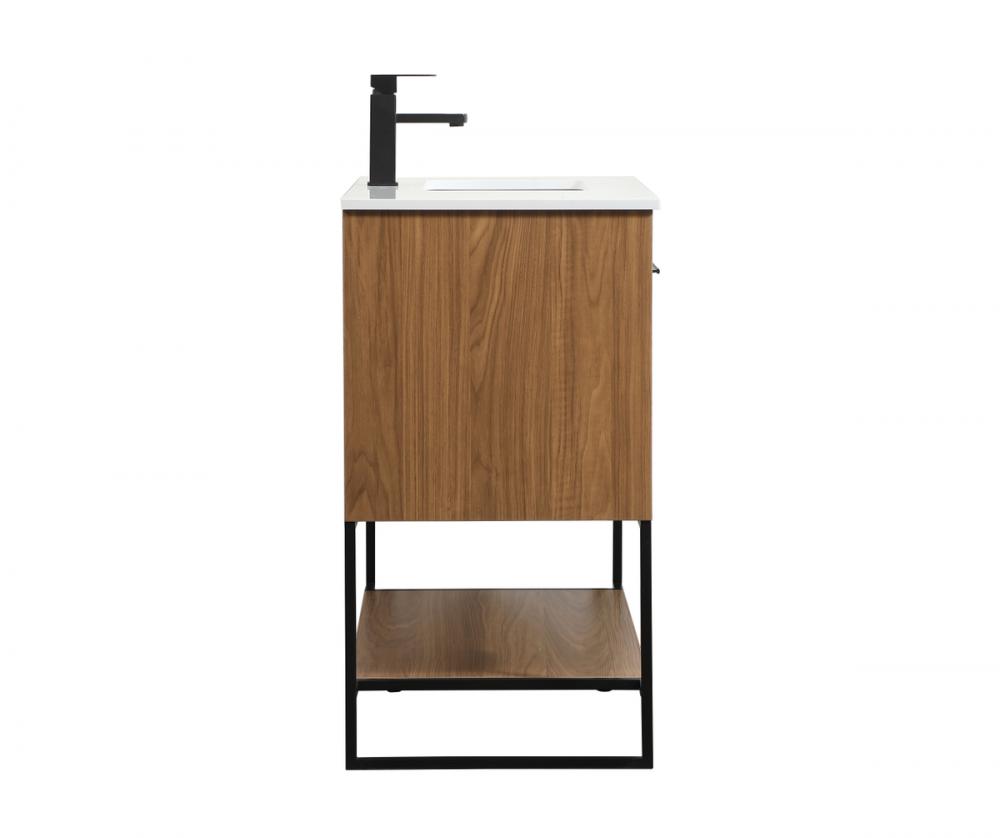 Live in comfort with this modern vanity. Dressed in a walnut brown and modern black metal hardware, its sleek style will have your bathroom or powder room elevated in industrial sophistication. The open shelf at the base and two doors reveal ample storage space for your bathroom essentials. Clean lines create its own visual interest, adding trendy looks to your already chic room.