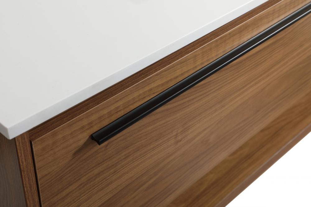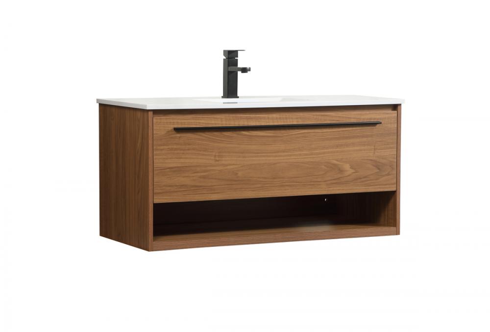 Save space and make your bathroom appear bigger with this floating vanity. Its minimal design will have you in awe, while its clean lines will leave your room feeling fresh and uncluttered. The Single u-drawer pulls out for storage while the open space below allows you to place extra towels or various other essentials. The ivory white engineered marble counter top with porcelain sink adds refined luxe while the aluminum barpull style handle adorn the vanity face.